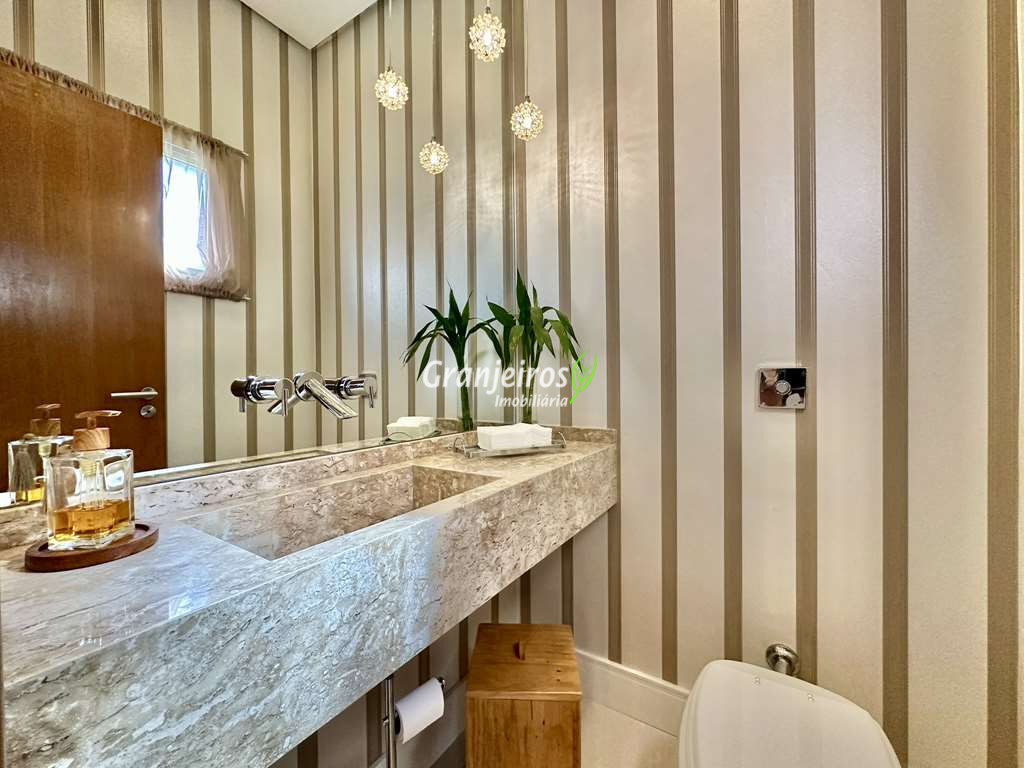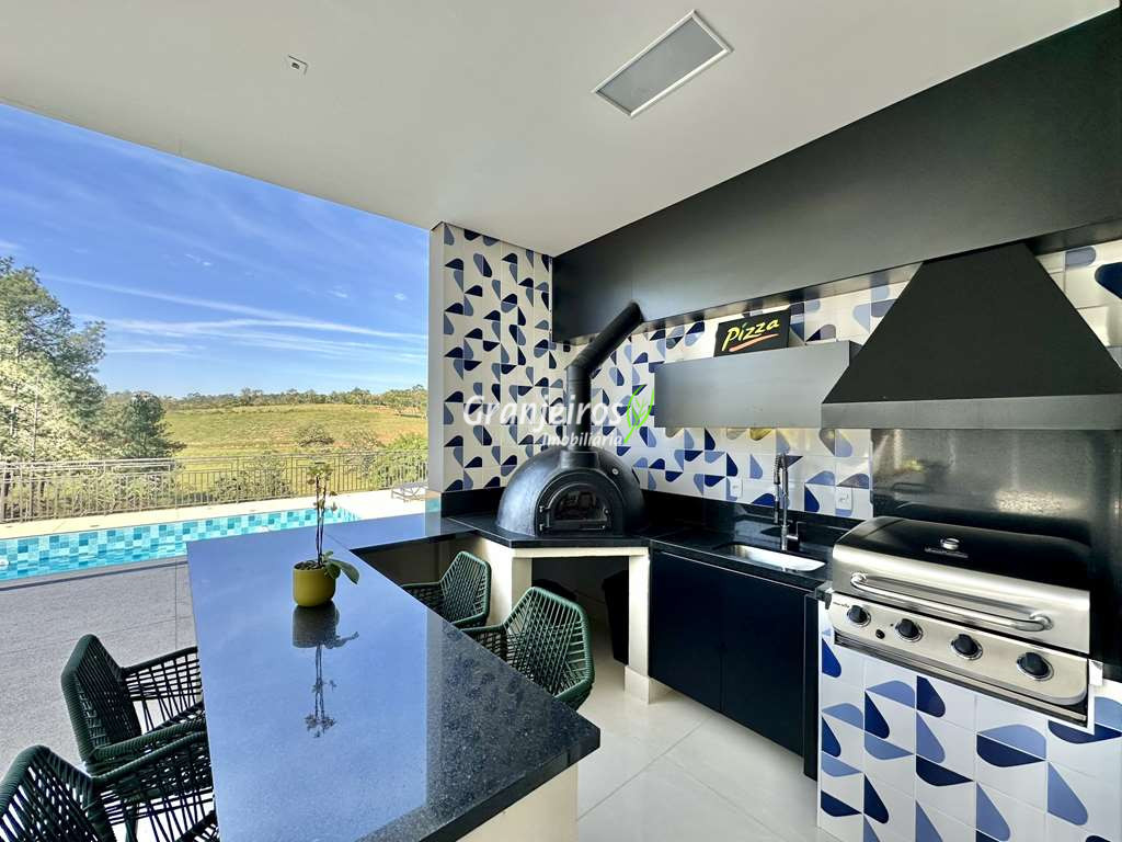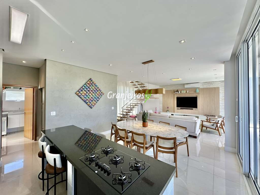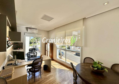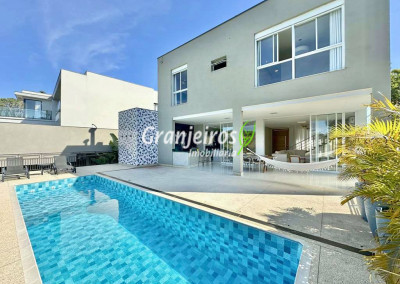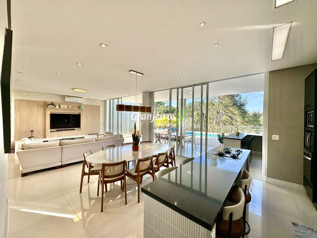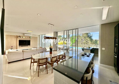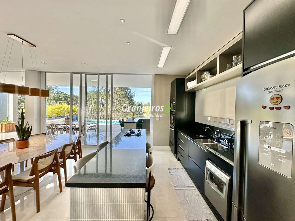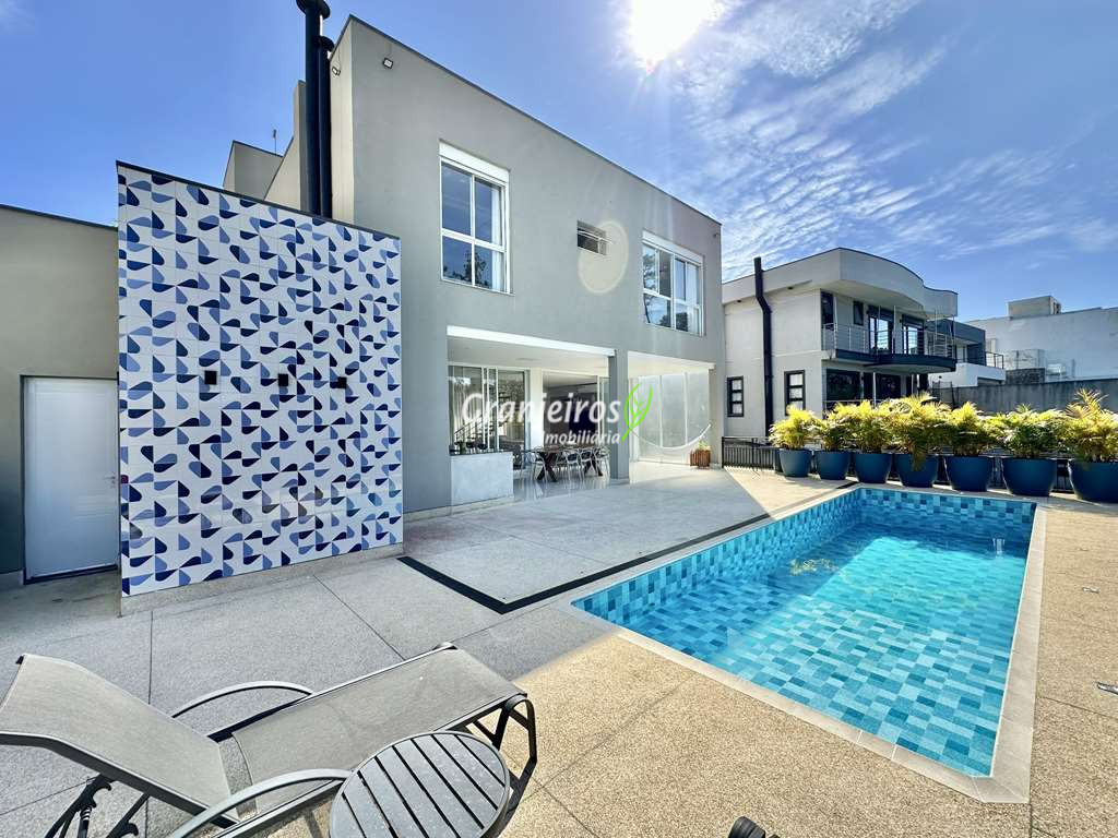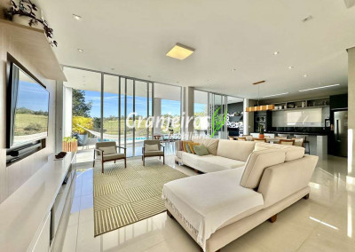 Casa moderna, living integrado ao lazer, completa! Totalmente planejada e equipada. Total privacidade e vista! Condomínio completo excelente. Imóvel repleto de armários planejados. Ar-condicionado em todos os ambientes. Jardim com paisagismo. Living para 6 ambientes integrados, com ar-condicionado Q e F, voltado para varanda Gourmet. Estar, lareira gás, TV, jantar, bar/café e cozinha. Lavabo decorado com tampo em travertino. Área íntima com roupeiro, escritório e 3 suítes. Escritório planejado com porta de correr, ar-condicionado Q e F. 3 suítes com janelas panorâmicas envidraçadas, com persianas elétricas, sendo 1 suíte com espaço para closet e a suíte master com closet maior sr e sra. Cozinha planejada com despensa. Varanda Gourmet integrada, voltada para piscina, com privacidade e vista. Forno de pizza, churrasqueira a gás. Piscina iluminada, preparada para aquecimento com prainha, hidro, grande solarium com vista panorâmica e casa de máquinas. Espaço para hidro e ducha. Garagem para 4 vagas, sendo 2 cobertas.