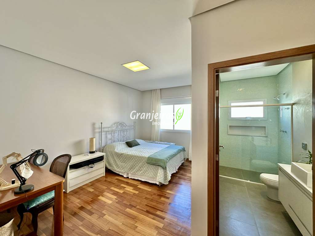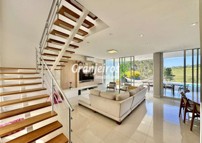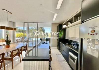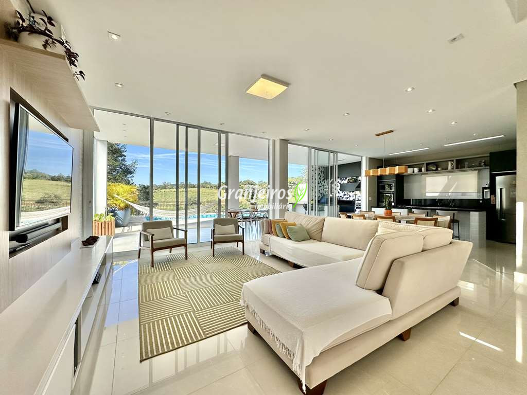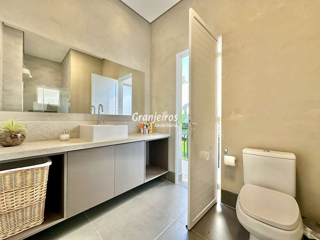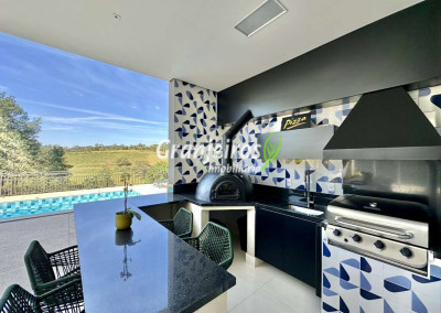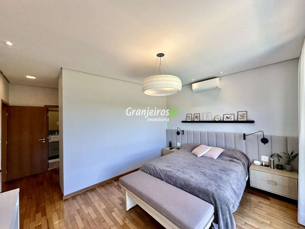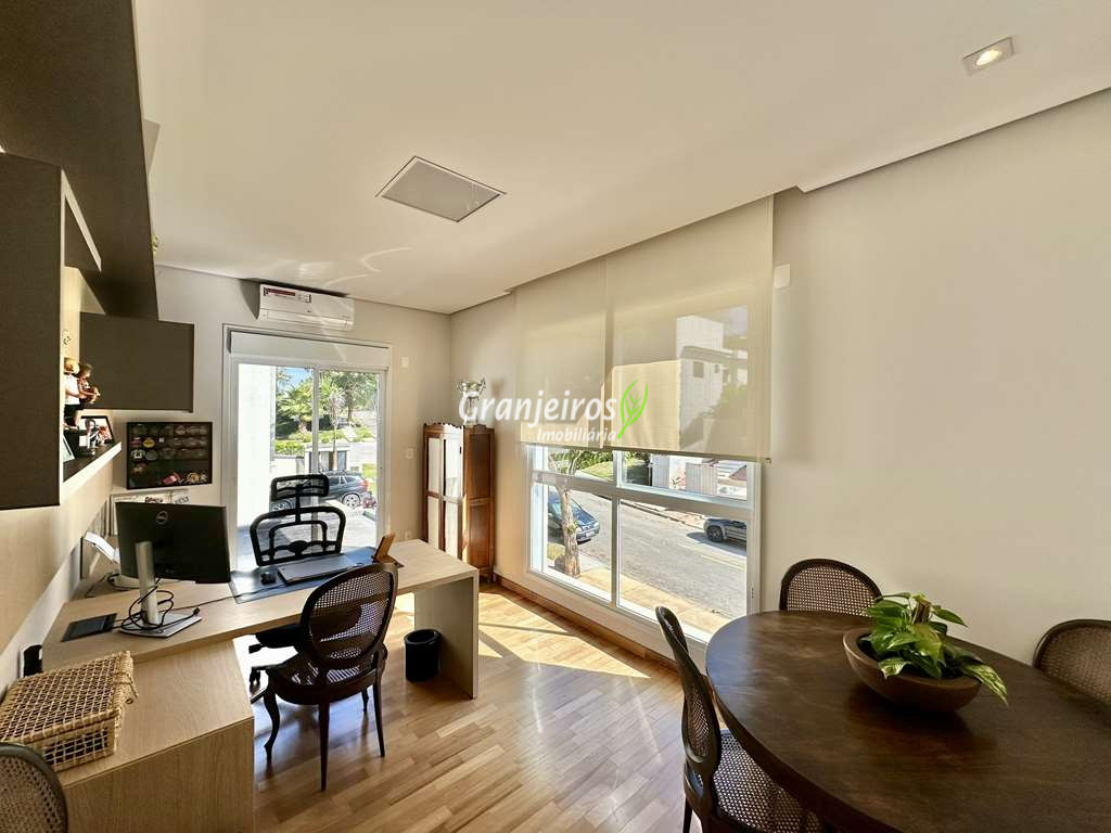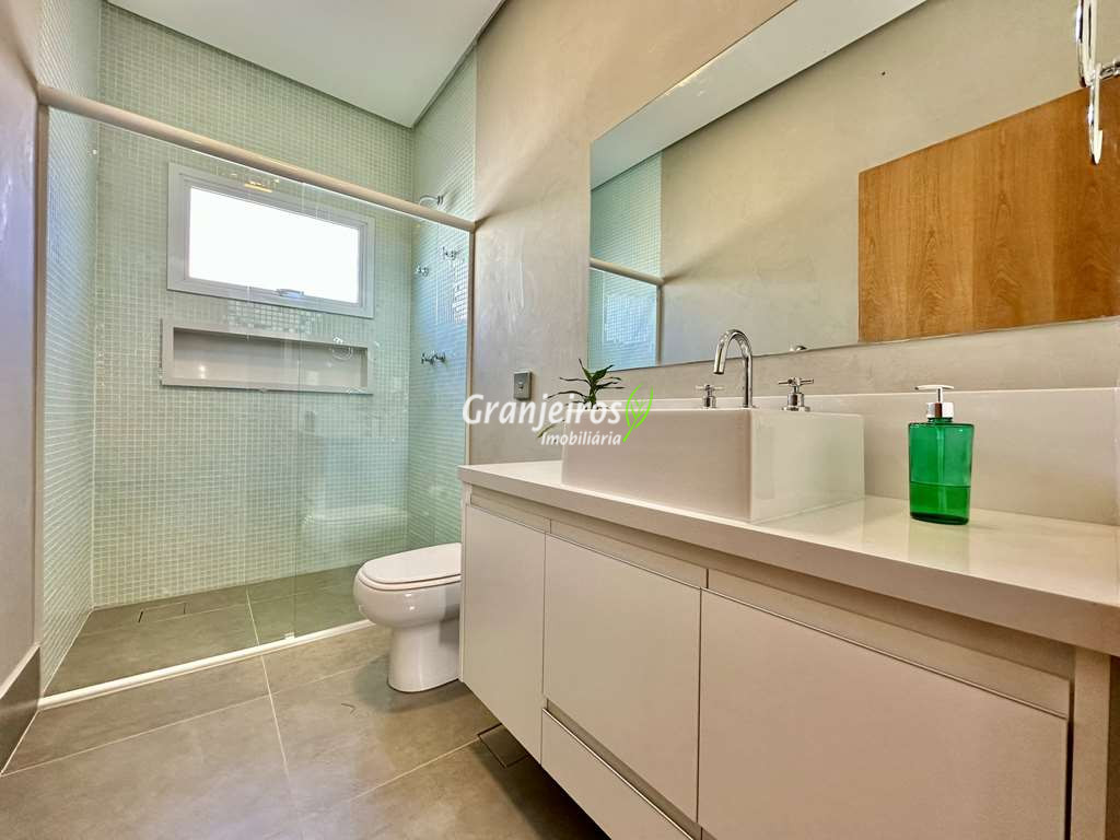 Casa moderna, living integrado ao lazer, completa! Totalmente planejada e equipada. Total privacidade e vista! Condomínio completo excelente. Imóvel repleto de armários planejados. Ar-condicionado em todos os ambientes. Jardim com paisagismo. Living para 6 ambientes integrados, com ar-condicionado Q e F, voltado para varanda Gourmet. Estar, lareira gás, TV, jantar, bar/café e cozinha. Lavabo decorado com tampo em travertino. Área íntima com roupeiro, escritório e 3 suítes. Escritório planejado com porta de correr, ar-condicionado Q e F. 3 suítes com janelas panorâmicas envidraçadas, com persianas elétricas, sendo 1 suíte com espaço para closet e a suíte master com closet maior sr e sra. Cozinha planejada com despensa. Varanda Gourmet integrada, voltada para piscina, com privacidade e vista. Forno de pizza, churrasqueira a gás. Piscina iluminada, preparada para aquecimento com prainha, hidro, grande solarium com vista panorâmica e casa de máquinas. Espaço para hidro e ducha. Garagem para 4 vagas, sendo 2 cobertas.