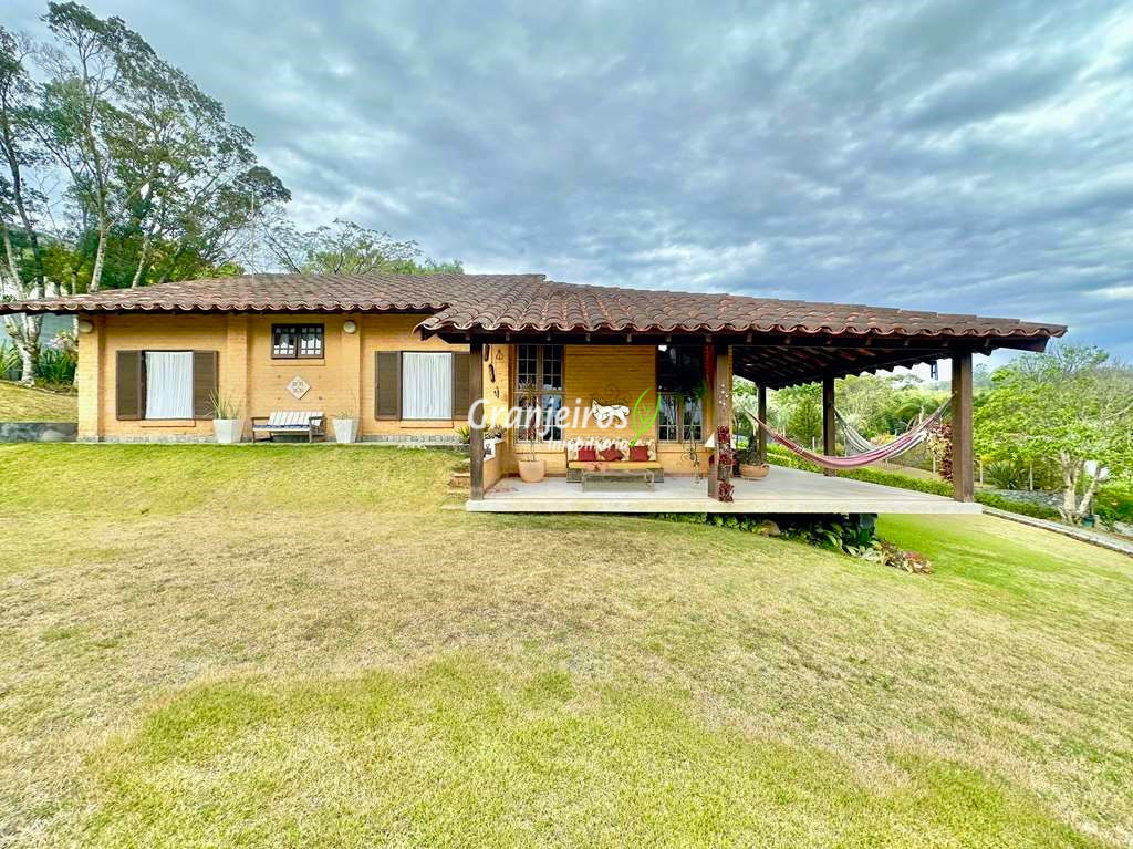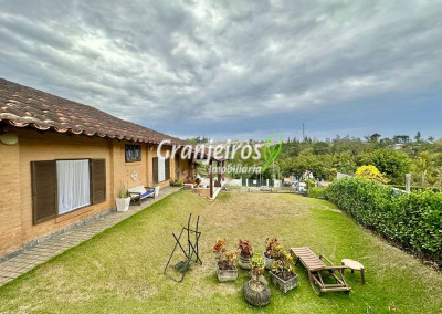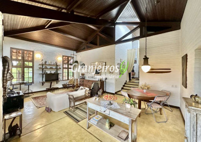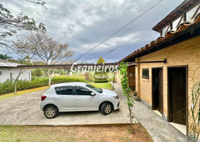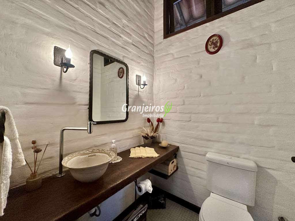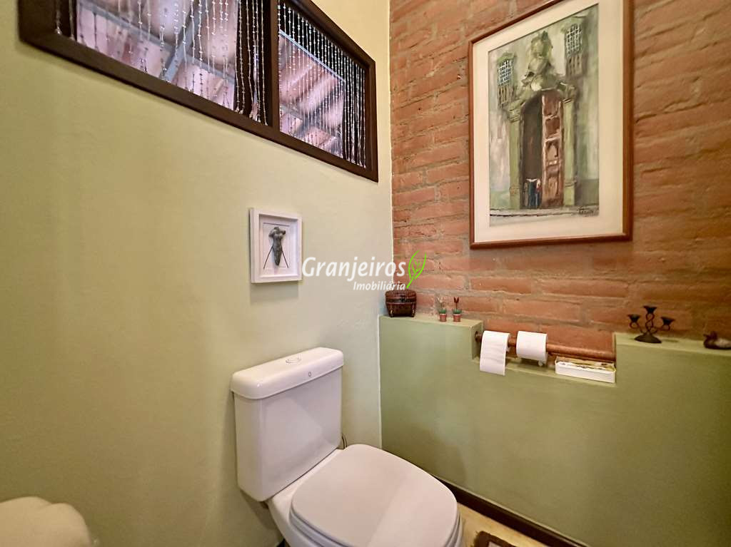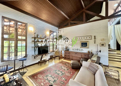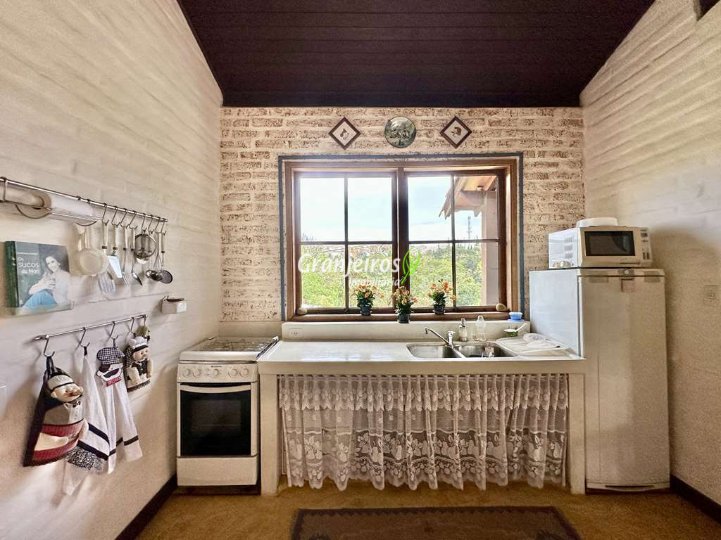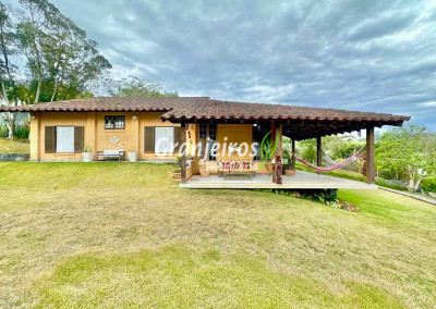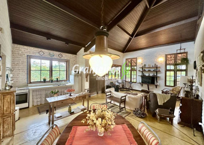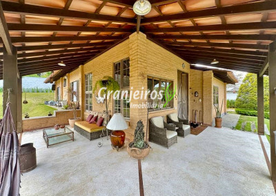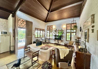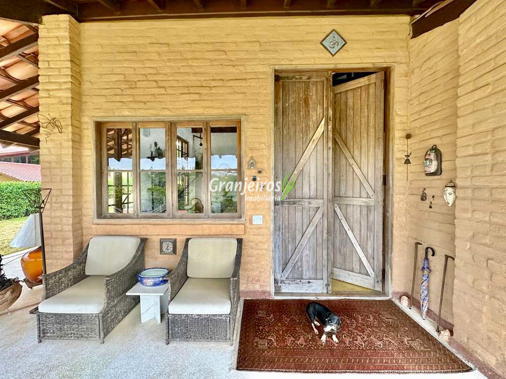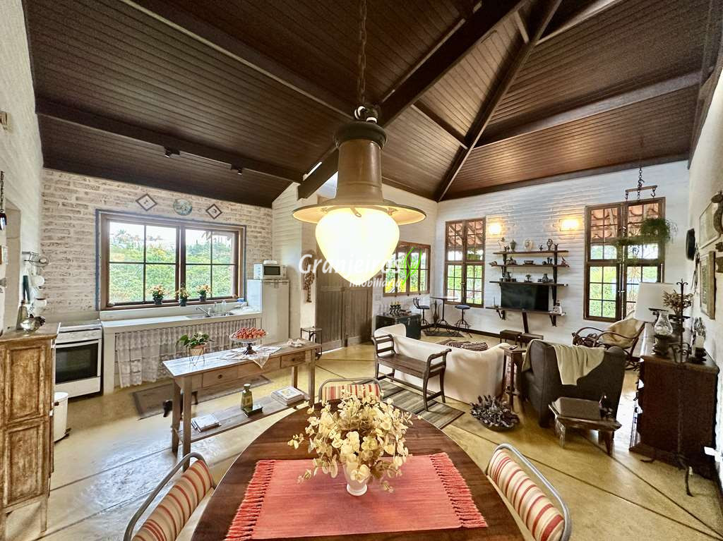 Um achado! “Simple chic”. Porteira fechada. Casa com móveis, utensílios, tapetes e maioria dos quadros. Vão tirar somente objetos pessoais e uma ou outra obra de arte. Casa estilo rústico fino, com tijolos antigos maiores que o padrão, receberam na parte externa uma nata de cimento com o pó do próprio tijolo. Piso interno de cimento queimado rústico em tom amarelado e piso da varanda em fulget. O telhado recebeu telhas de tamanho especial (acima do padrão) que dão um charme especial. Na área social, ampla sala para dois ambientes com porta e janelas originais das Docas de Santos. Anexo as salas, uma grande varanda para apreciar o incrível por de sol, especialmente no outono, conforme pode -se verificar nas fotos. Lavabo com tampo de madeira maciça rústica e pia em cerâmica artesanal (exclusiva). A cozinha fica integrada as salas e conta com uma boa despensa. Na área íntima, temos um amplo hall de distribuição para os dois quartos, grande closet que pode vir o terceiro quarto, e escritório. O banheiro possui a área de banho separada do lavatório. O terreno é um caso a parte, conta com paisagismo, repleto de árvores e flores, além da linda vista para o sol poente. A casa é abastecida por um Poço com 18m e caixa d’água de 3000 litros. Também com opção para abastecimento Sabesp. Ampla área de estacionamento e com pergolado florido muito agradável.