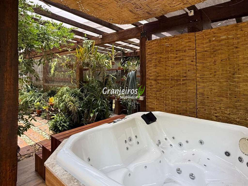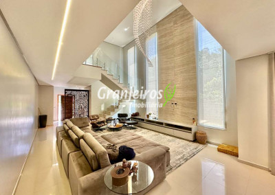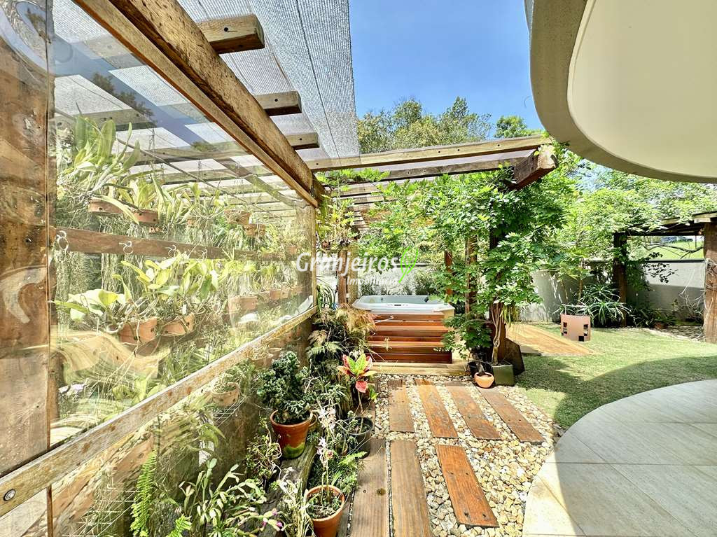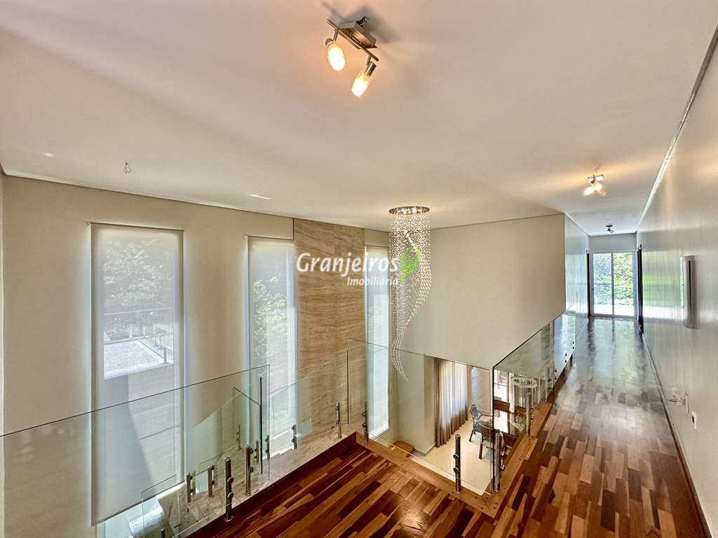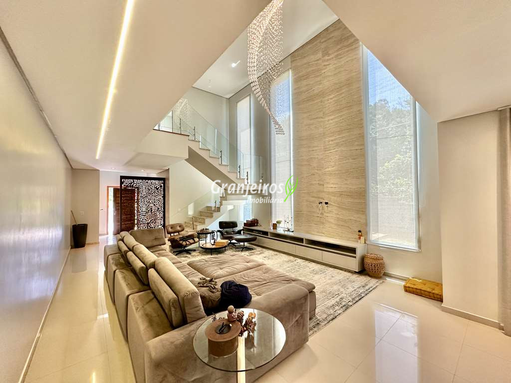Casa com lindo projeto arquitetônico e de decoração. Espaçosa, elegante, com excelente acabamento e infraestrutura completa. O Condomínio Reserva Santa Maria está entre os mais completos charmosos e seguros da região. Casa envidraçada, bem arejada e iluminada. Amplo living integrado com pé direito alto, para 4 ambientes. Estar, TV, jantar e bar. 5 ar-condicionado Q e F, nas 4 suítes e escritório. Imóvel repleto de armários. Jardim com paisagismo formado, orquidário e frutíferas: jabuticabeira c/ 30 anos produzindo, amora, limão siciliano, limão rosa, cereja. Living com pé direito alto, para 4 ambientes integrados, voltados para varanda gourmet e jardim. Escritório no térreo com ar-condicionado, todo planejado com estação de trabalho, prateleiras, gabinetes. Cozinha planejada, integrada ao living e varanda gourmet, com balcão para sala de jantar, tampos em granito, fogão cooktop 5 bocas Electro Lux e 2 cubas inox. Hall íntimo no piso superior. São 5 suítes planejadas com armários, 2 com terraços integrados e guarda corpo de vidro. Sendo a master planejada para cama king size, closet sr e sra com janela e 1ste no térreo com acessibilidade, ideal para hóspedes. VARANDA GOURMET planejada e integrada ao SPA, orquidário e redário, churrasqueira. SPA com Hidro Ouro Fino para 6 pessoas, com cromoterapia, ozônio e cascata. Orquidário com 200 vasos, feito com dormentes de trem e cruzetas da Eletropaulo. Garagem para 11 vagas sendo 3 cobertas. Aquecimento: Solar com suporte de Boiler Elétrico.