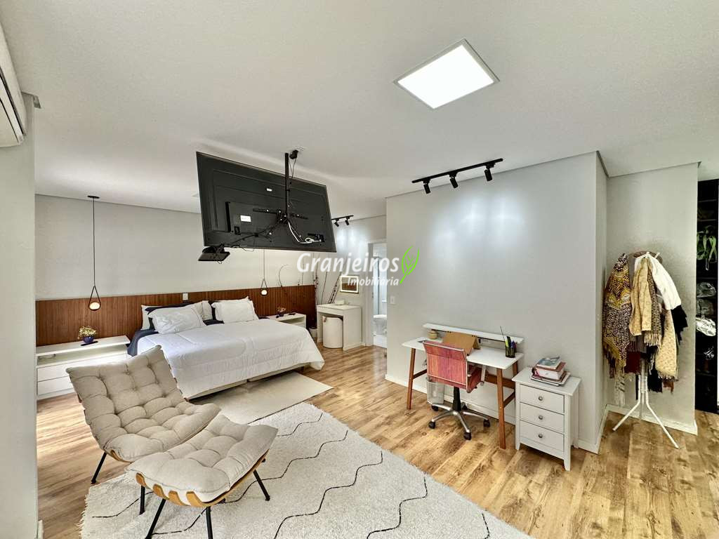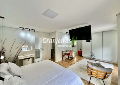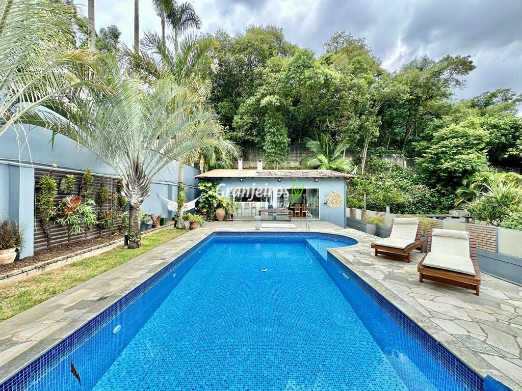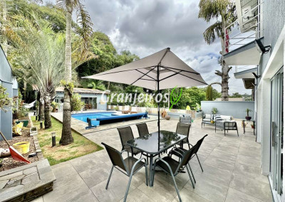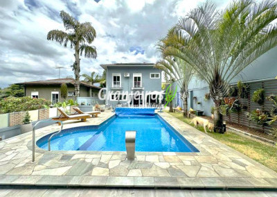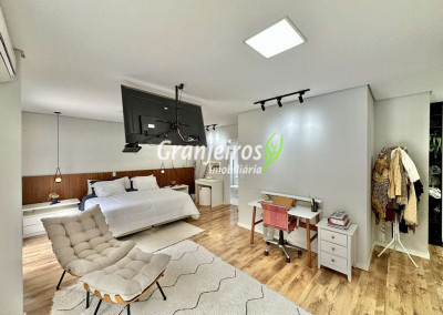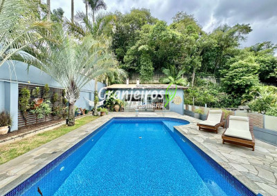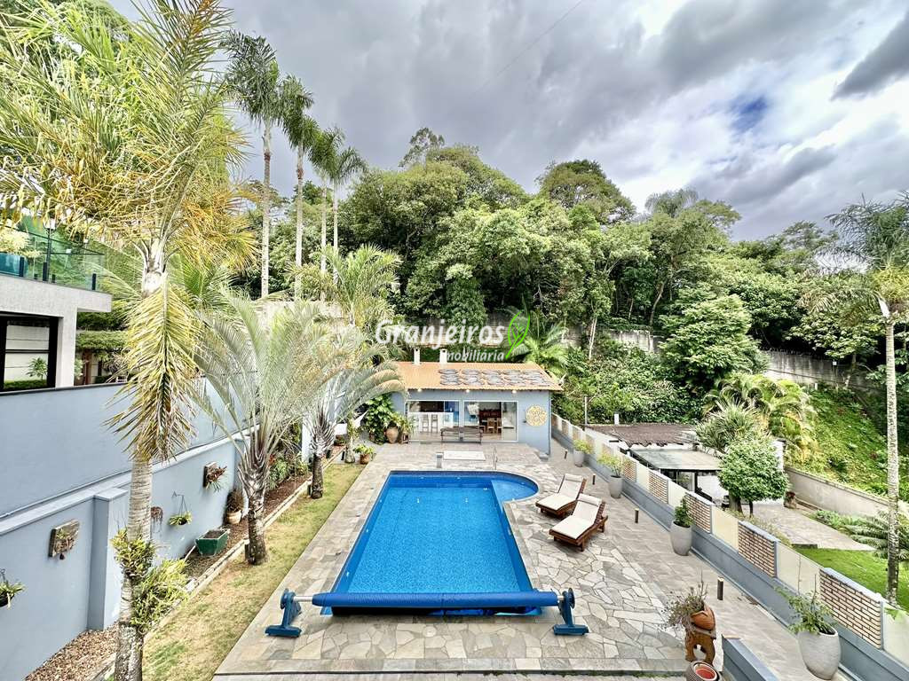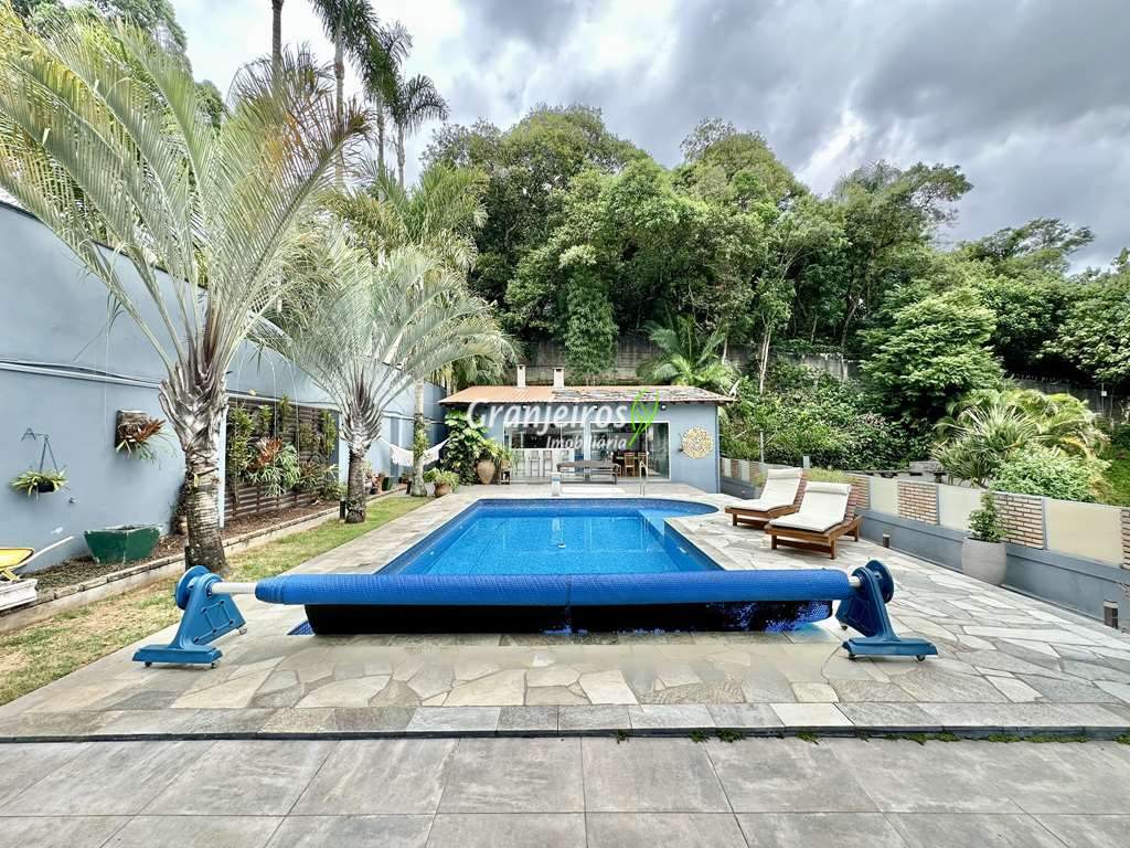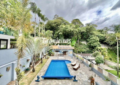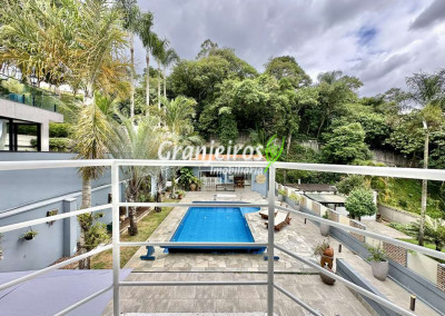 Casa contemporânea, integrada, com vista permanente e muito bom acabamento. Imóvel repleto de armários. ⚡ Energia elétrica fotovoltaica on-grid com 1400 kilowatts. Casa toda cabeada para internet. Lavabo. Escritório. Living para 5 ambientes integrados, voltados para o lazer com piscina e anexo gourmet. Estar, TV, jantar, lareira e bar. Cozinha integrada ao living com bancada em “L”. Área de serviço aberta ensolarada e lavanderia fechada com tanque e armários planejado. Family room. PROJETO ORIGINAL 4 suítes, sendo 1 suíte Master. PROJETO ATUAL 3 suítes com ar-condicionado, armários e terraços, sendo a master reformada, unificada e ampliada para MASTER PLUS, com 2 closets sr e sra. com 2 banheiros sr e sra e Hidro. Piscina 8m x 4m, aquecida por trocador de calor, iluminada, com prainha, cascata, ducha, solarium. Churrasqueira Fogo de Chão, entre a piscina e o Salão de Festas Gourmet. Salão de festas com churrasqueira, fogão à lenha, espaço para bar, estar, TV, Lavabo. Sauna úmida com ducha. Vestiário. Espaço para academia com TV, jogos, brinquedoteca, atelier. Garagem para 4 vagas, sendo 2 cobertas