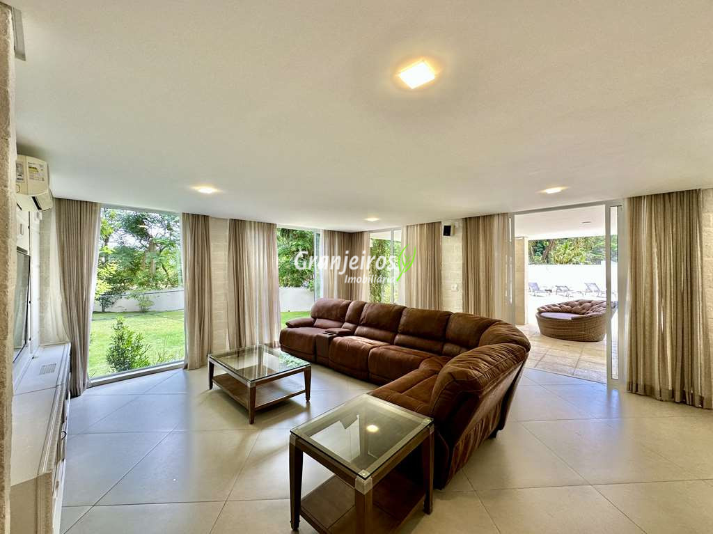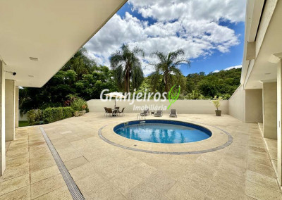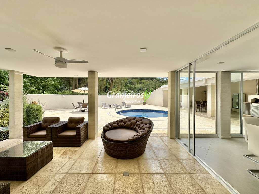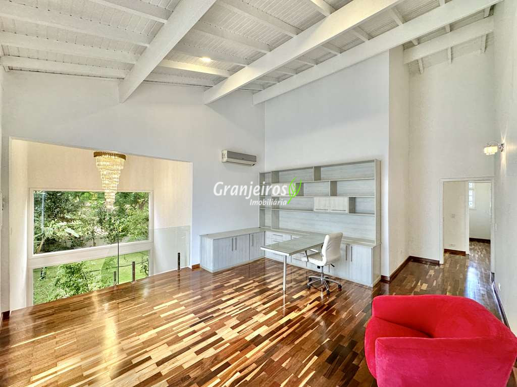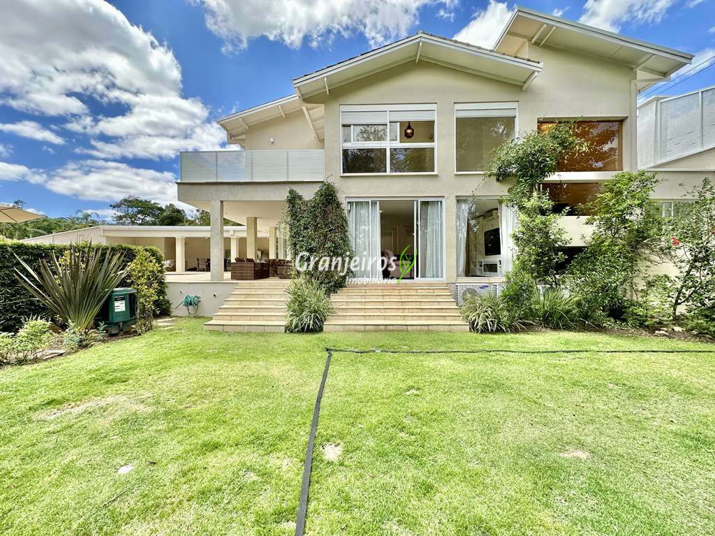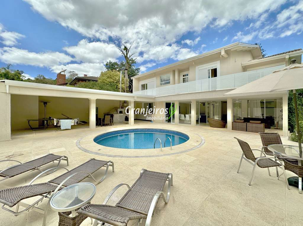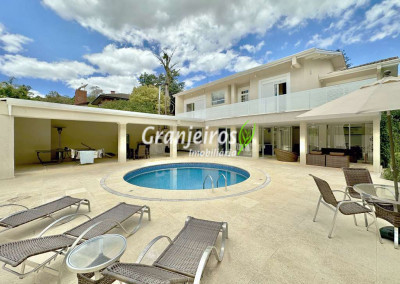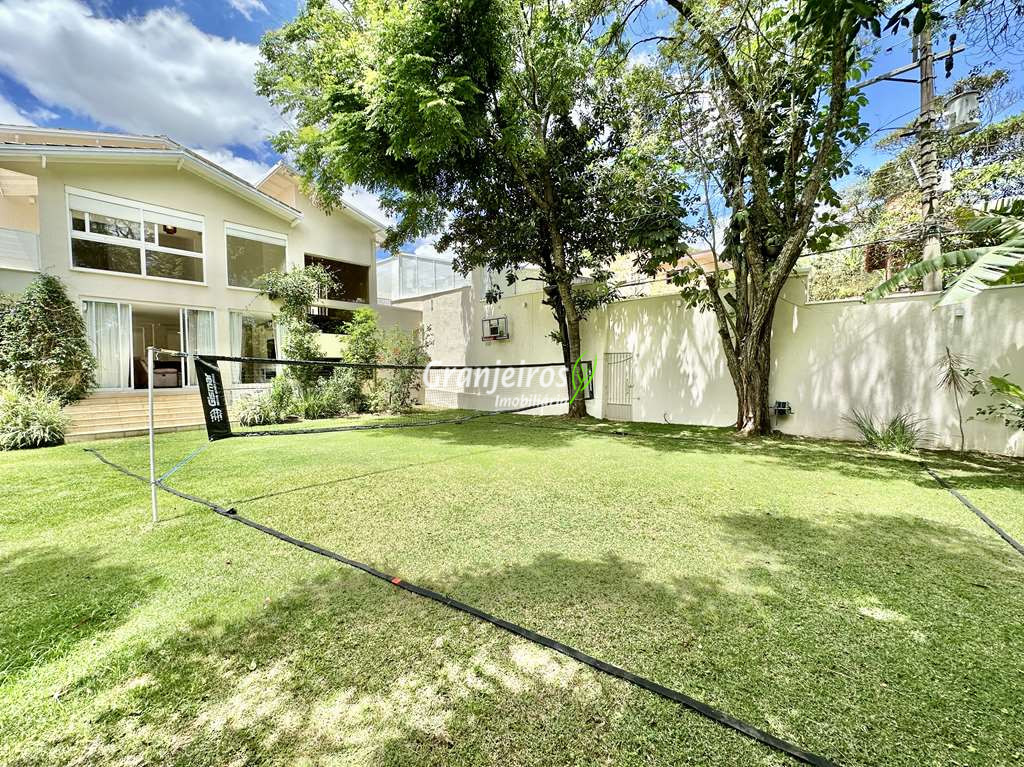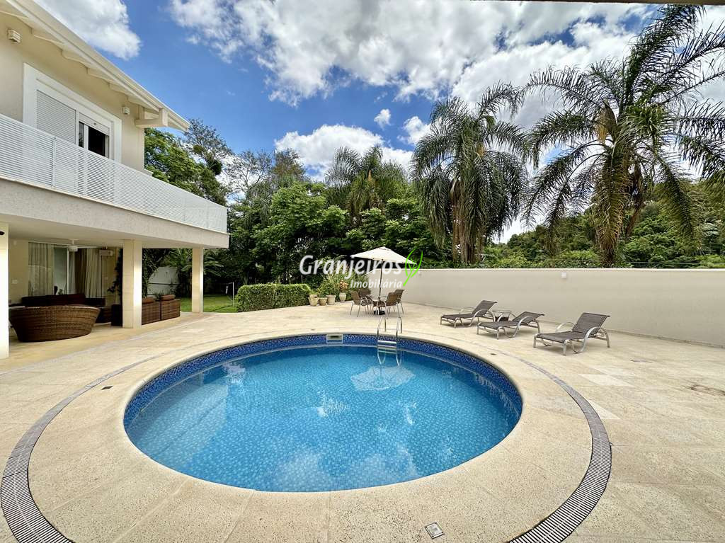 Porteira Fechada! Casa contemporânea reformada, integrada e mobiliada. Rua tranquila e arborizada sem saída. Muita privacidade e com vista para área preservada. Imóvel repleto de armários. Projeto de paisagismo formado, com grande gramado. Living para 6 ambientes integrados com ar-condicionado Q e F, voltados para o lazer com varanda gourmet, piscina e jardim. Estar, TV/home theater equipado, lareira à gás, sofá importado, bar, jantar, almoço, lavabo e cozinha. Cozinha planejada, integrada à sala jantar, almoço/café da manhã e varanda gourmet, repleta de armários, Escritório envidraçado com grande varanda voltada para natureza e jardim. São 3 suítes planejadas com closets, ar-condicionado Q e F, varandas e terraços, sendo a master com saleta anexa e closet sr e sra. Banheiros com tampos em mármore quartzo, espelho, gabinetes e box de vidro. Sendo a master com tampo em “L”, espelho grande, 2 cubas e banheira. Área de serviço aberta ensolarada e lavanderia fechada com tanque, armários. Varanda gourmet com churrasqueira inox, forno de pizza inox, coifa inox e depósito para lenha e carvão. Piscina redonda de alvenaria, aquecida por trocador de calor, iluminada com grande solário. Quadra de beach tênis no jardim. SALÃO MULTIUSO 56 m² (14m x 4 m). Ideal para academia, jogos, festa, ballet, home office, atelier, estúdio, música, cinema. Garagem: 3 vagas cobertas.