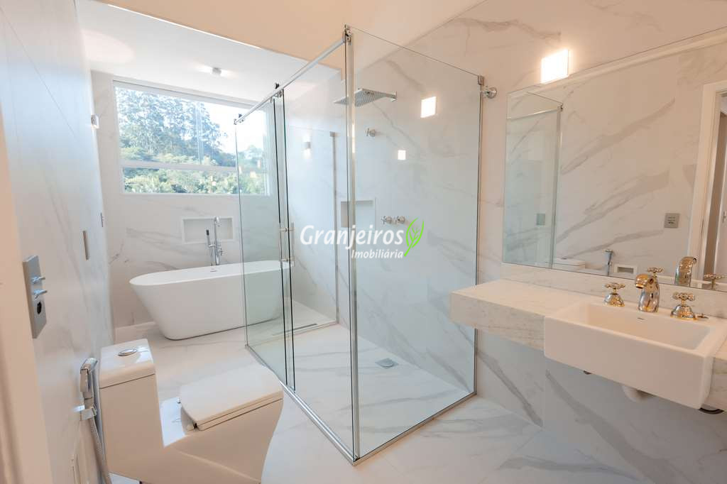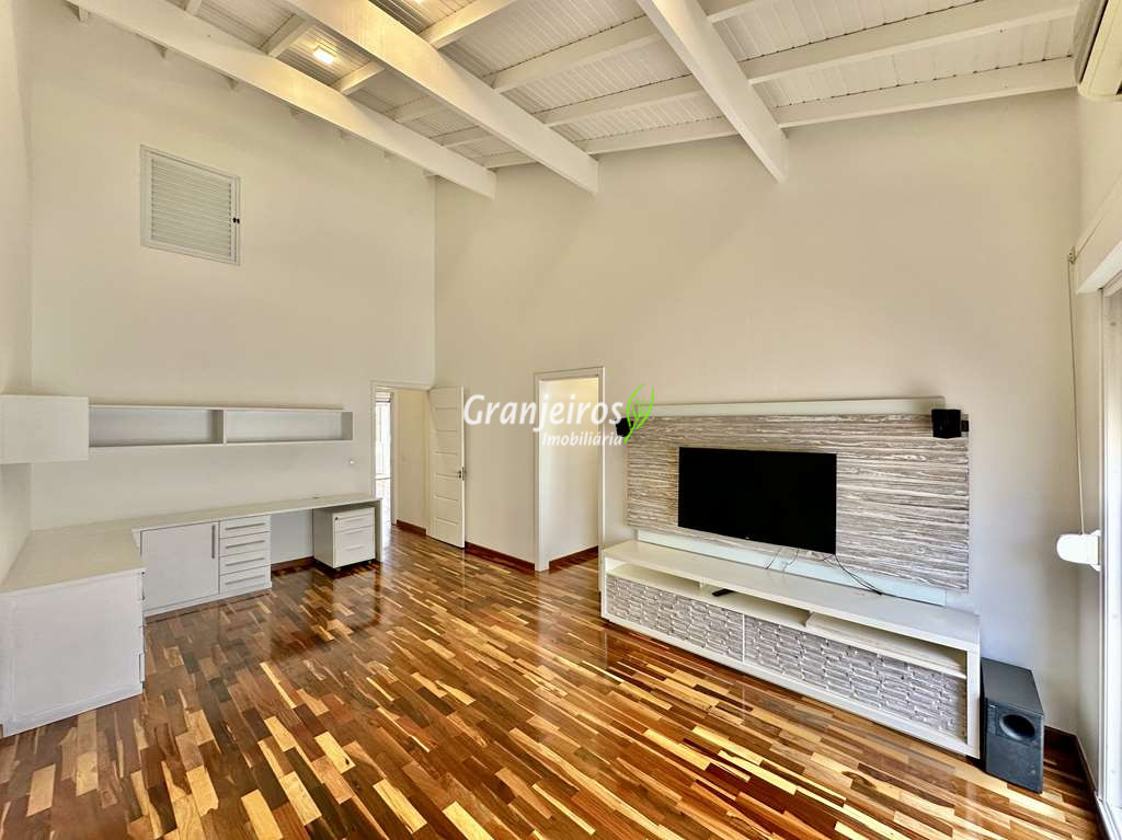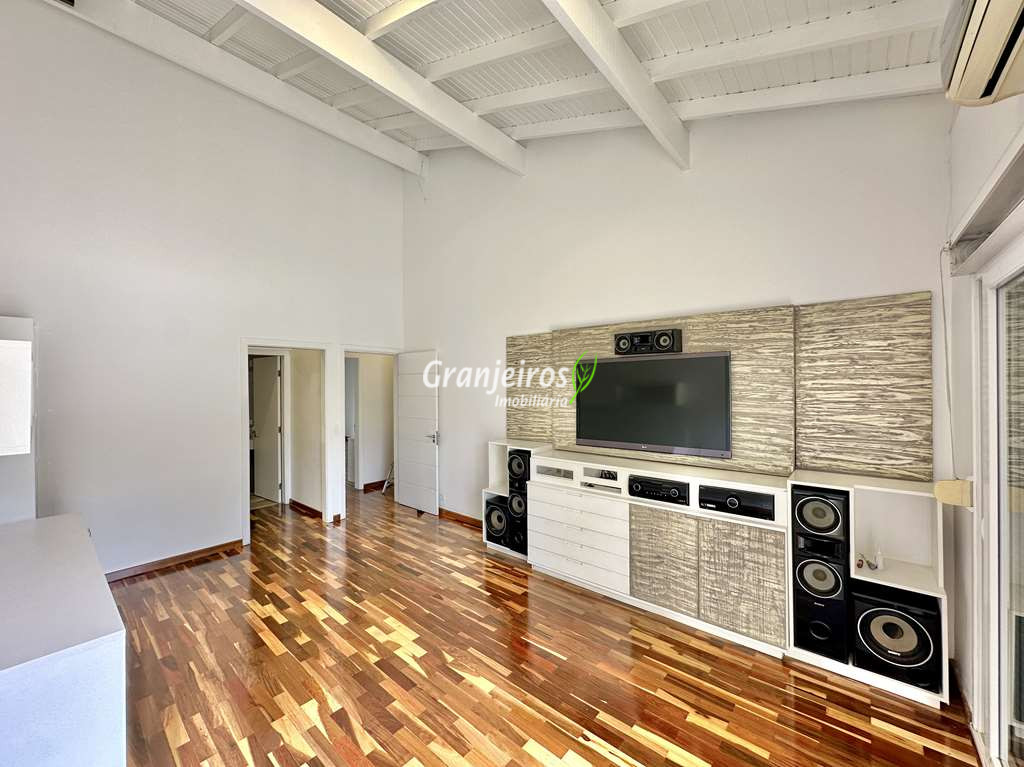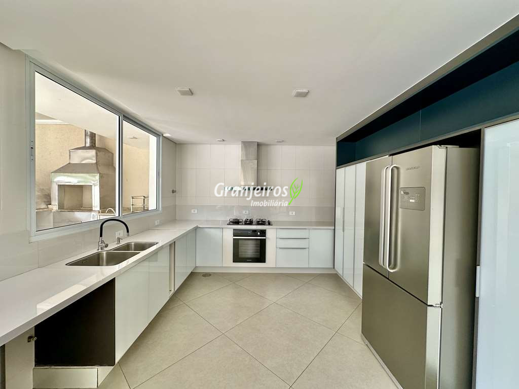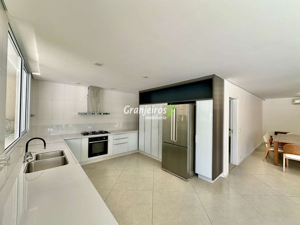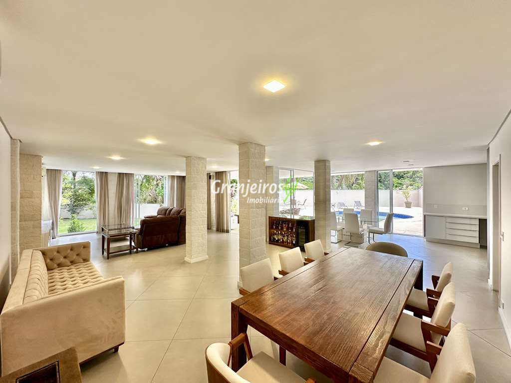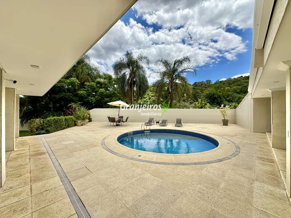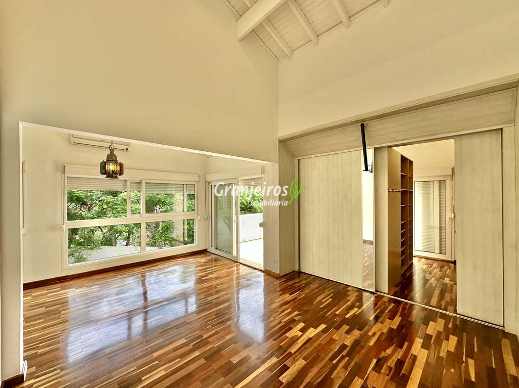 Porteira Fechada! Casa contemporânea reformada, integrada e mobiliada. Rua tranquila e arborizada sem saída. Muita privacidade e com vista para área preservada. Imóvel repleto de armários. Projeto de paisagismo formado, com grande gramado. Living para 6 ambientes integrados com ar-condicionado Q e F, voltados para o lazer com varanda gourmet, piscina e jardim. Estar, TV/home theater equipado, lareira à gás, sofá importado, bar, jantar, almoço, lavabo e cozinha. Cozinha planejada, integrada à sala jantar, almoço/café da manhã e varanda gourmet, repleta de armários, Escritório envidraçado com grande varanda voltada para natureza e jardim. São 3 suítes planejadas com closets, ar-condicionado Q e F, varandas e terraços, sendo a master com saleta anexa e closet sr e sra. Banheiros com tampos em mármore quartzo, espelho, gabinetes e box de vidro. Sendo a master com tampo em “L”, espelho grande, 2 cubas e banheira. Área de serviço aberta ensolarada e lavanderia fechada com tanque, armários. Varanda gourmet com churrasqueira inox, forno de pizza inox, coifa inox e depósito para lenha e carvão. Piscina redonda de alvenaria, aquecida por trocador de calor, iluminada com grande solário. Quadra de beach tênis no jardim. SALÃO MULTIUSO 56 m² (14m x 4 m). Ideal para academia, jogos, festa, ballet, home office, atelier, estúdio, música, cinema. Garagem: 3 vagas cobertas.