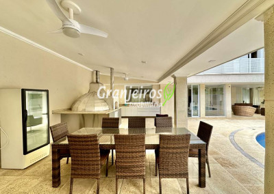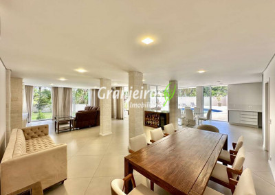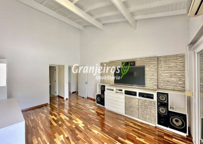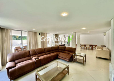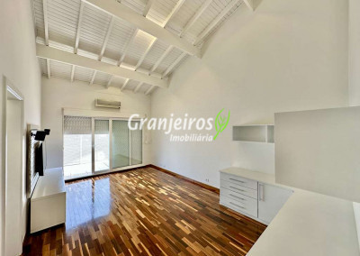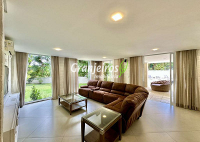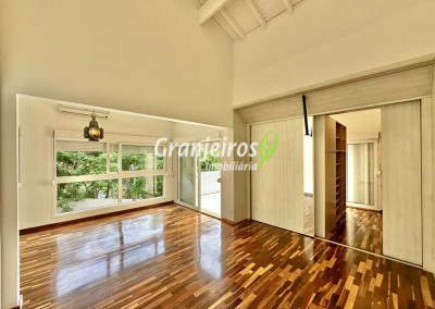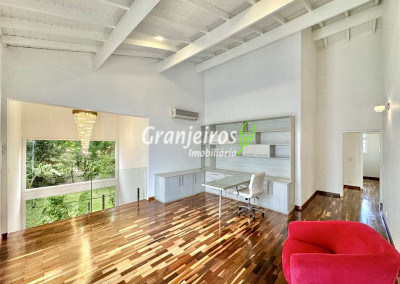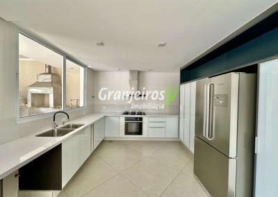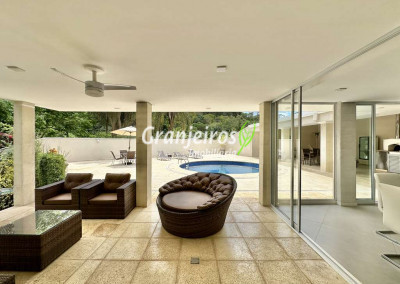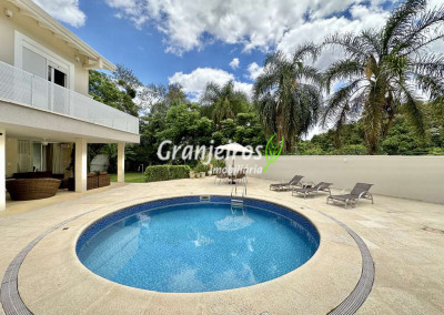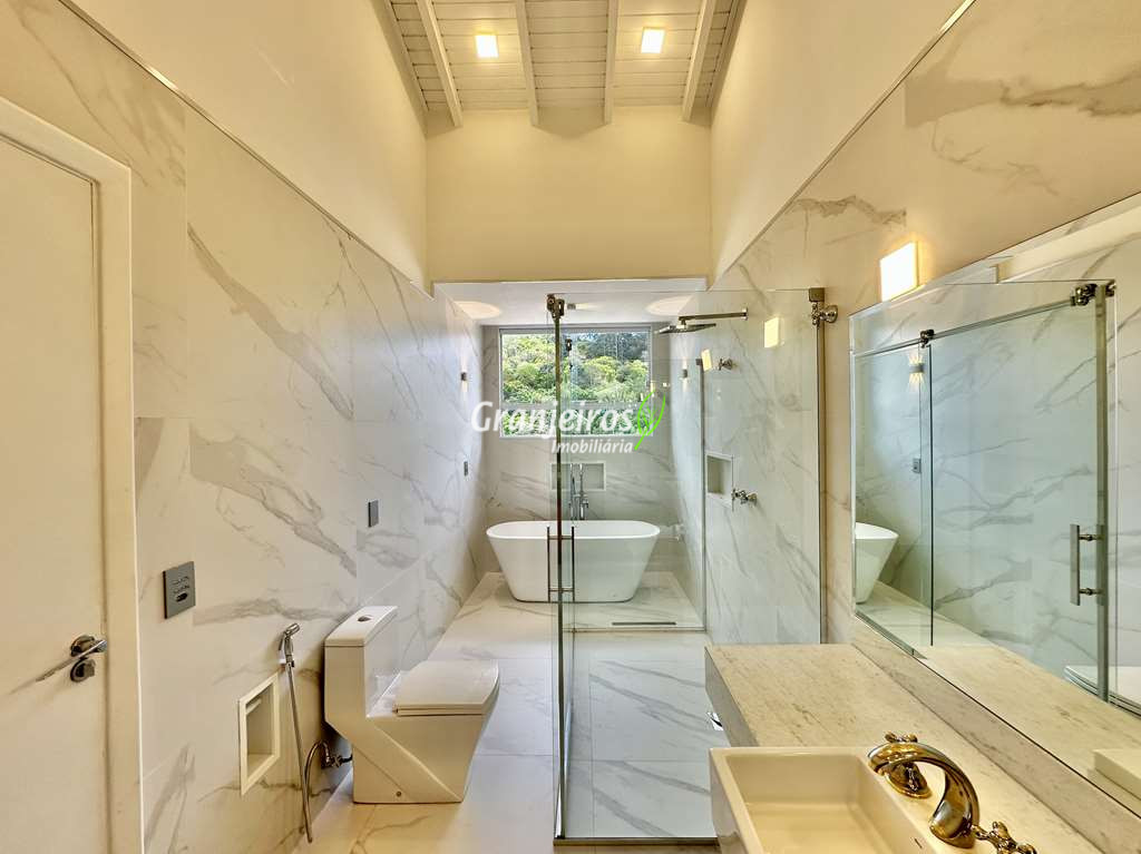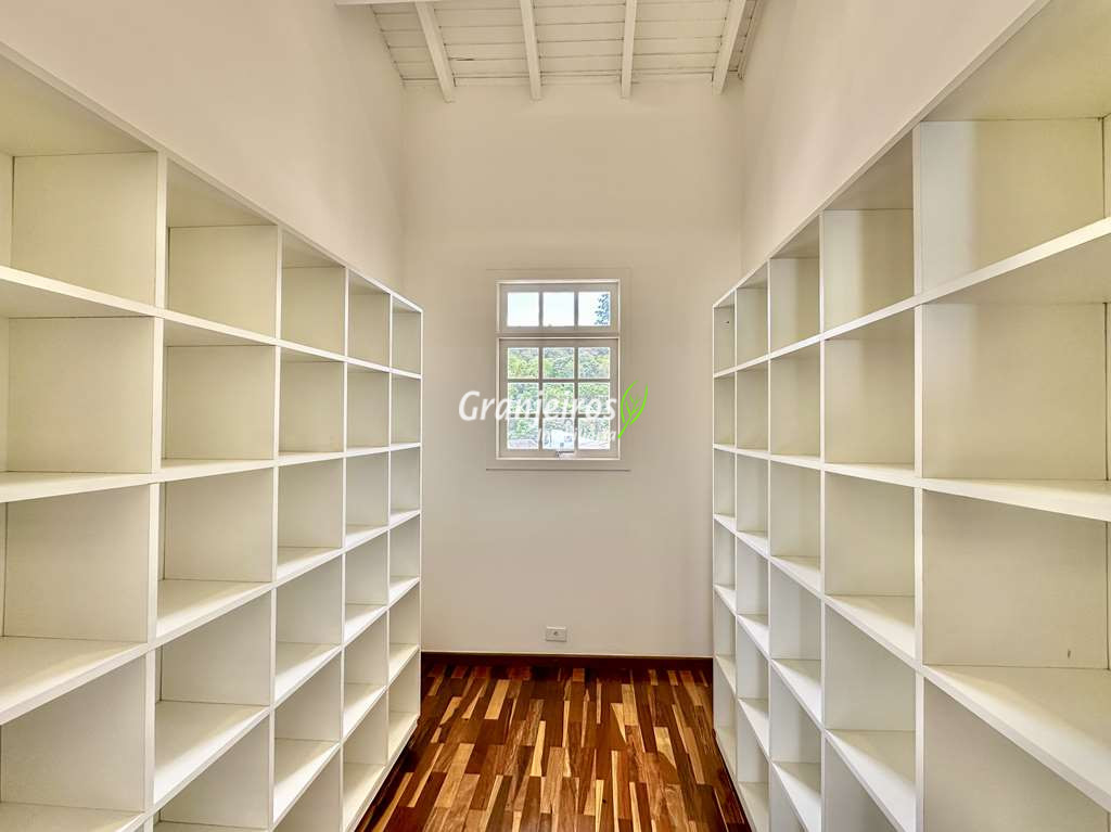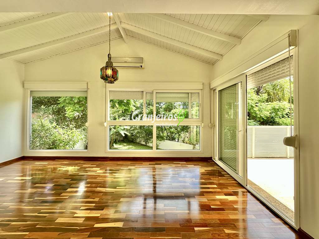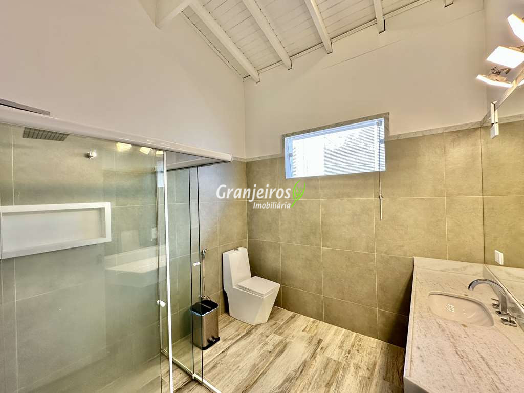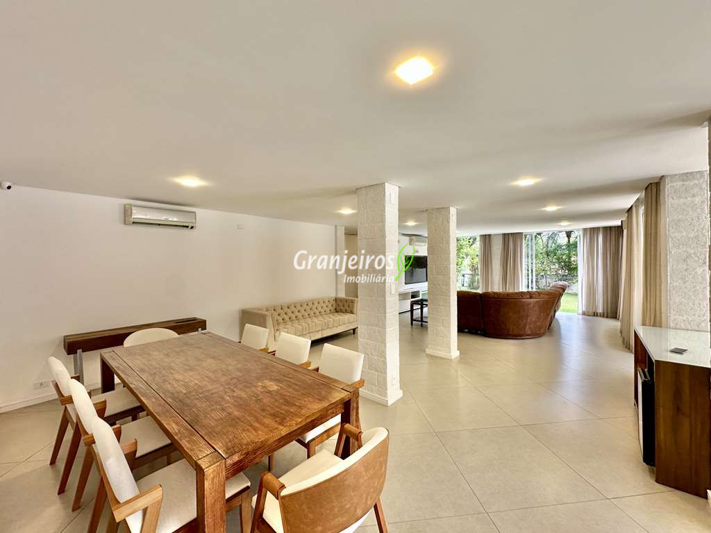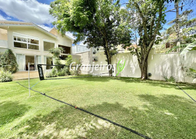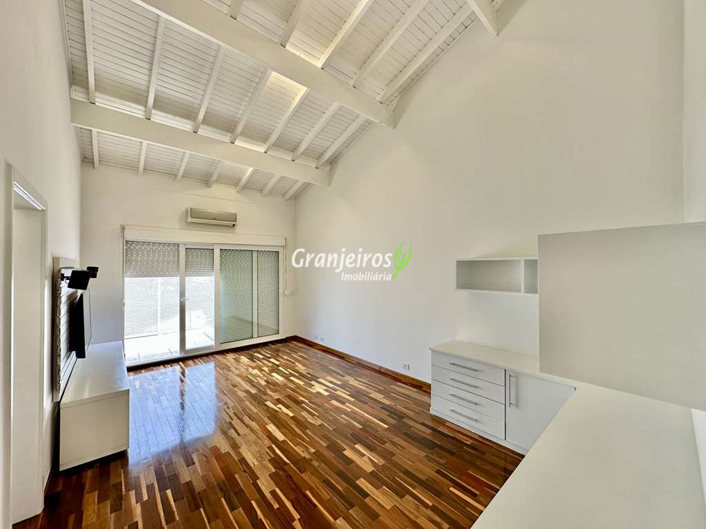 Porteira Fechada! Casa contemporânea reformada, integrada e mobiliada. Rua tranquila e arborizada sem saída. Muita privacidade e com vista para área preservada. Imóvel repleto de armários. Projeto de paisagismo formado, com grande gramado. Living para 6 ambientes integrados com ar-condicionado Q e F, voltados para o lazer com varanda gourmet, piscina e jardim. Estar, TV/home theater equipado, lareira à gás, sofá importado, bar, jantar, almoço, lavabo e cozinha. Cozinha planejada, integrada à sala jantar, almoço/café da manhã e varanda gourmet, repleta de armários, Escritório envidraçado com grande varanda voltada para natureza e jardim. São 3 suítes planejadas com closets, ar-condicionado Q e F, varandas e terraços, sendo a master com saleta anexa e closet sr e sra. Banheiros com tampos em mármore quartzo, espelho, gabinetes e box de vidro. Sendo a master com tampo em “L”, espelho grande, 2 cubas e banheira. Área de serviço aberta ensolarada e lavanderia fechada com tanque, armários. Varanda gourmet com churrasqueira inox, forno de pizza inox, coifa inox e depósito para lenha e carvão. Piscina redonda de alvenaria, aquecida por trocador de calor, iluminada com grande solário. Quadra de beach tênis no jardim. SALÃO MULTIUSO 56 m² (14m x 4 m). Ideal para academia, jogos, festa, ballet, home office, atelier, estúdio, música, cinema. Garagem: 3 vagas cobertas.