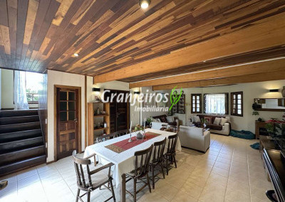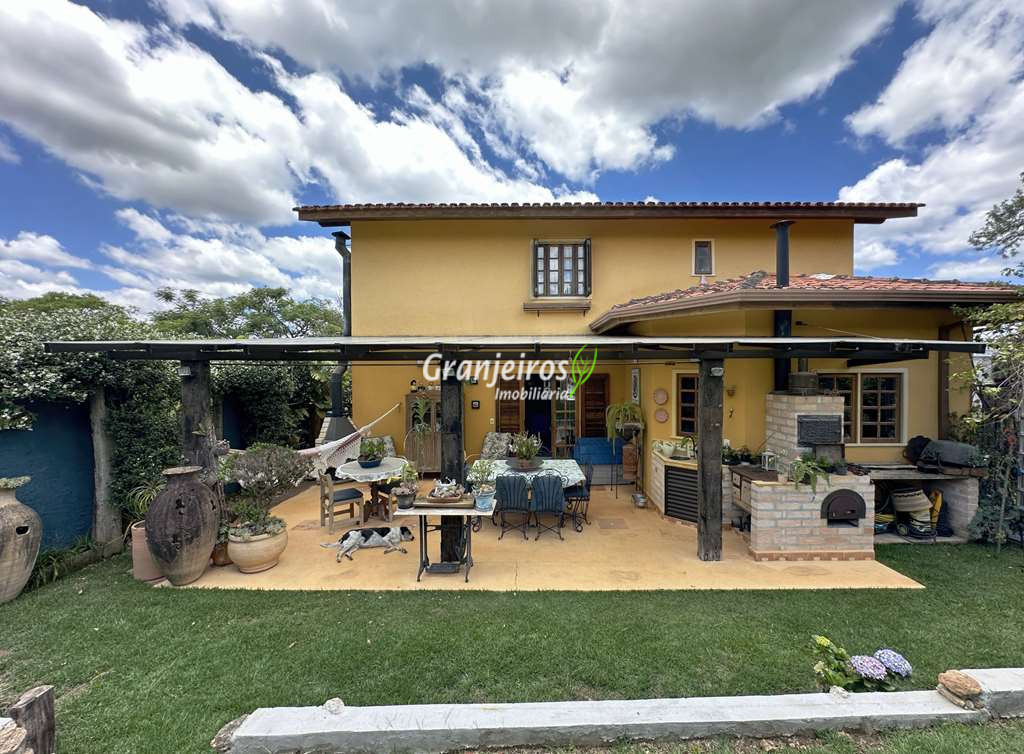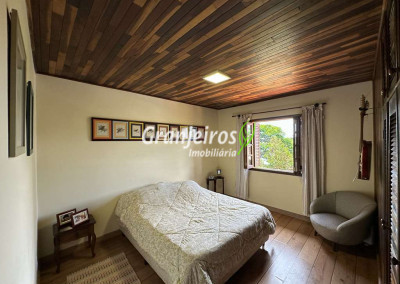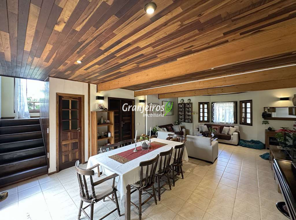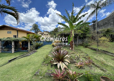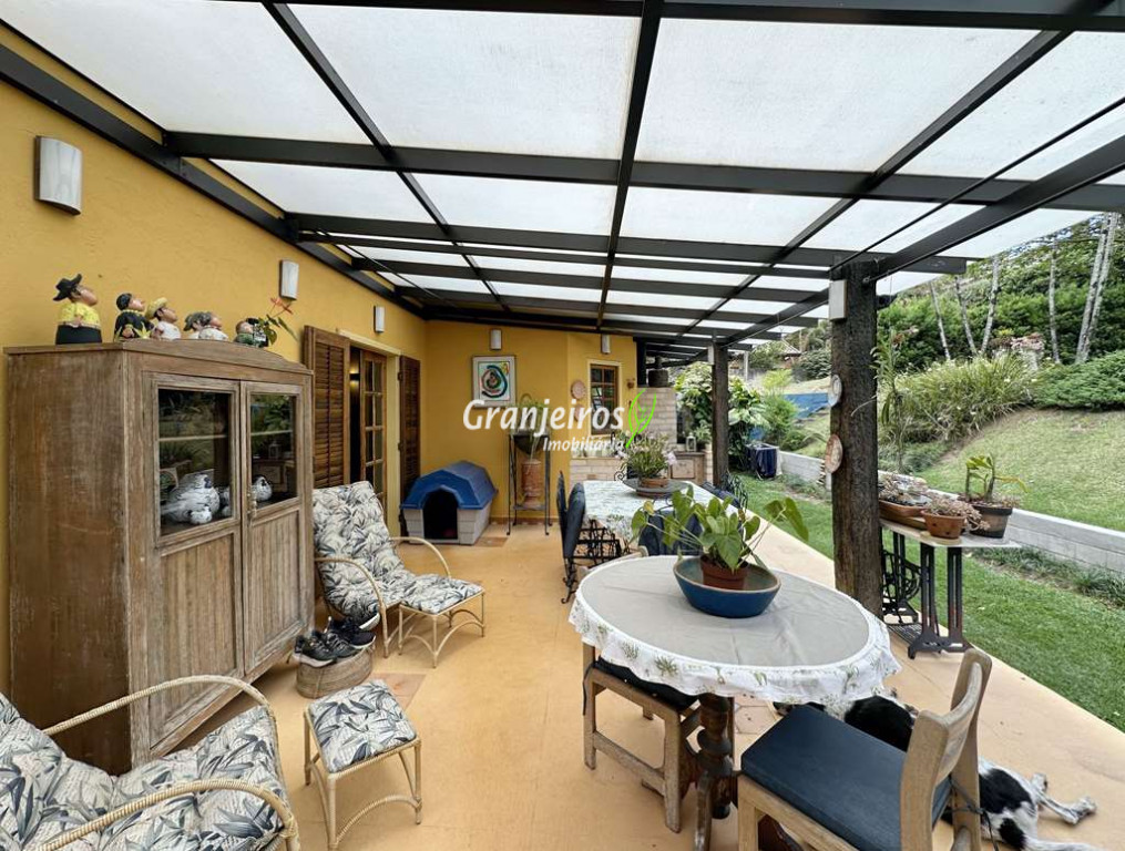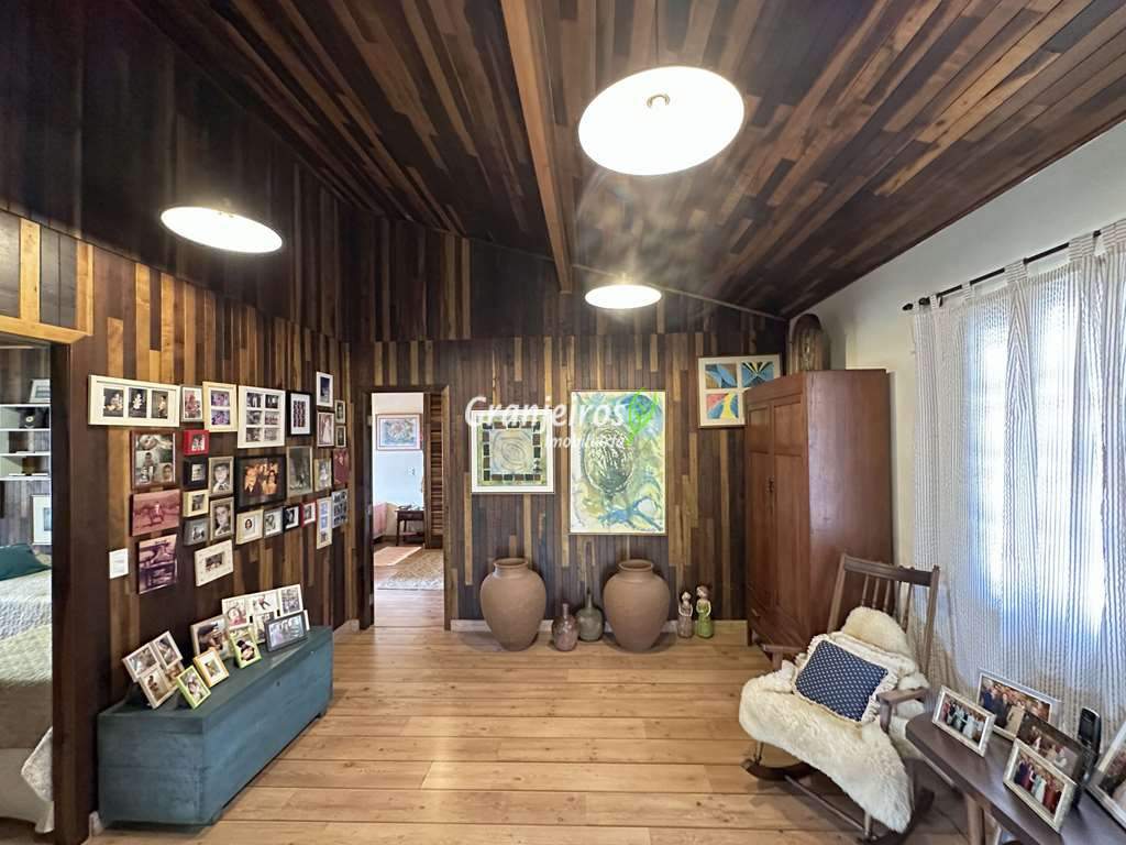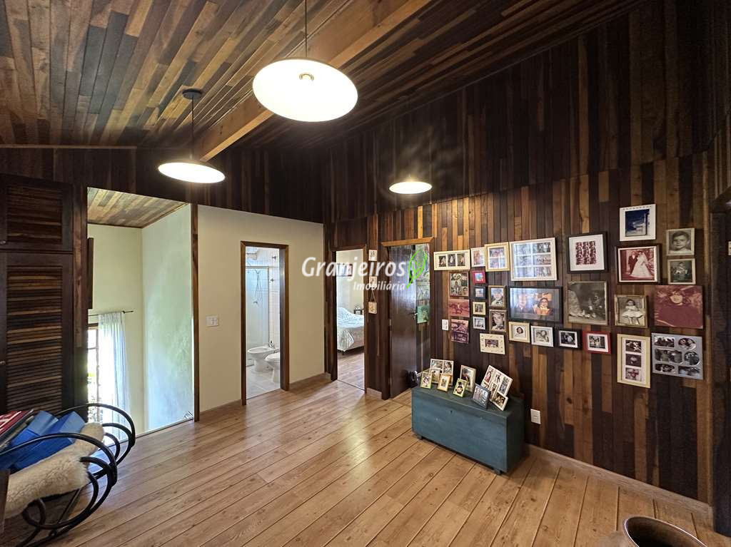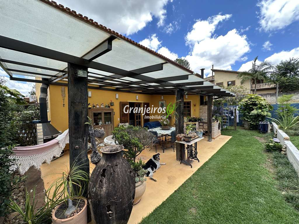 Casa rústica linda, avarandada, grande jardim com paisagismo e vista maravilhosa. Construção mista de alvenaria e madeira de lei (Imbuia). Ótima localização em rua tranquila e arborizada, sem saída. Grande jardim com paisagismo formado, frutíferas e gazebos. Living para 4 ambientes voltados para varanda e lazer, com grande jardim nos fundos e terreno lateral anexo. Estar, música, bar e jantar. Escritório/consultório com acesso interno, por uma entrada lateral externa independente. Varanda gourmet com cobertura de vidro, lareira e forno à lenha. Grande Jardim gramado, 3 gazebos, paisagismo formado com frutíferas, espaço para horta, pomar e piscina. Copa cozinha planejada repleta de armários com vista para o jardim. Área íntima com paredes internas de madeira. Hall íntimo / family room com roupeiro ideal para TV. São 3 dormitórios com armários, vista, sendo 1 suíte com ar-condicionado, closet e bay window. Banheiros com tampos em granito, espelho, gabinetes, box de vidro. 2 vagas descobertas.
