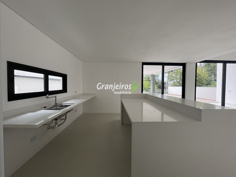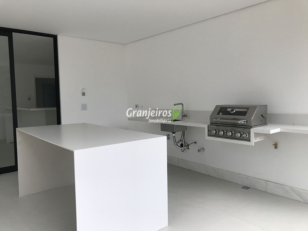 - Cozinha com mármore branco e ilha;