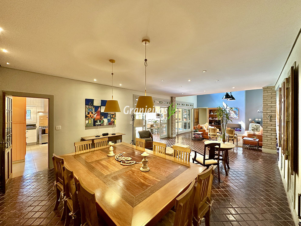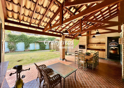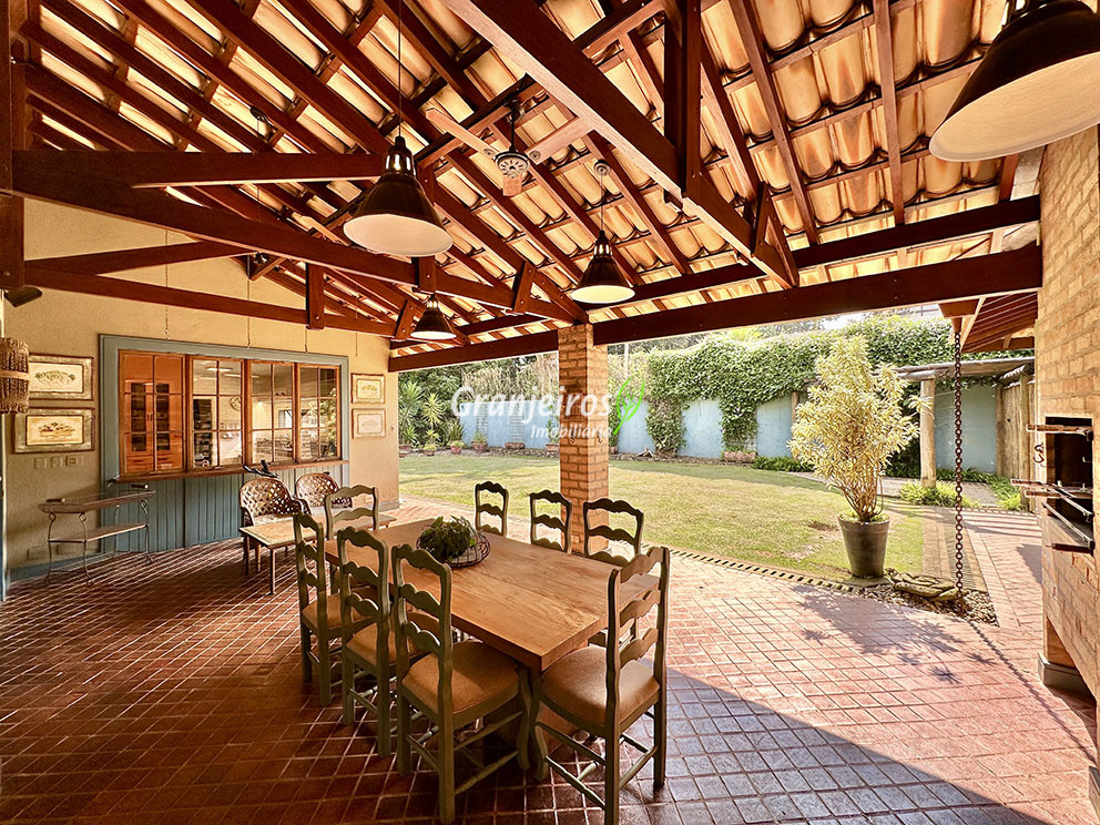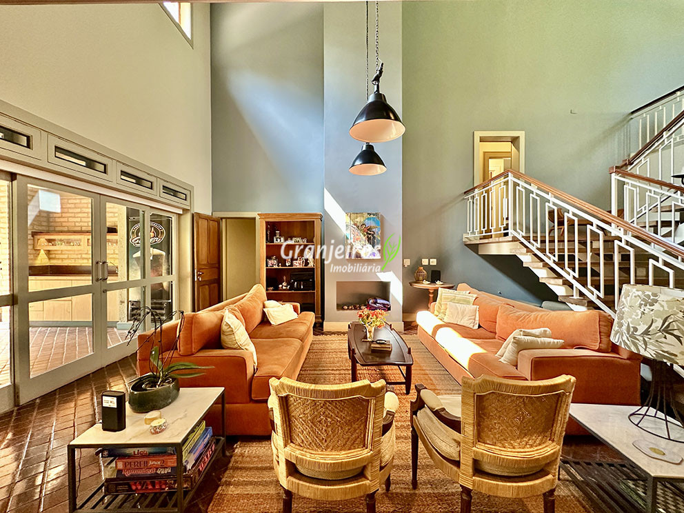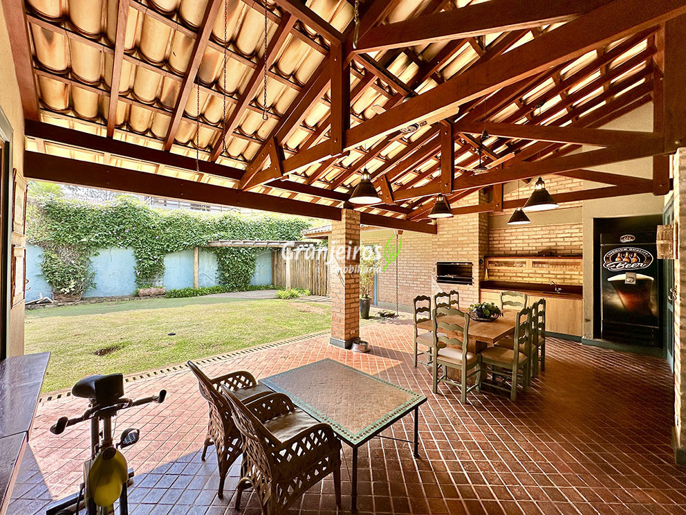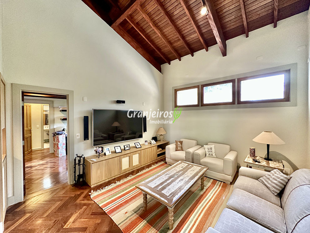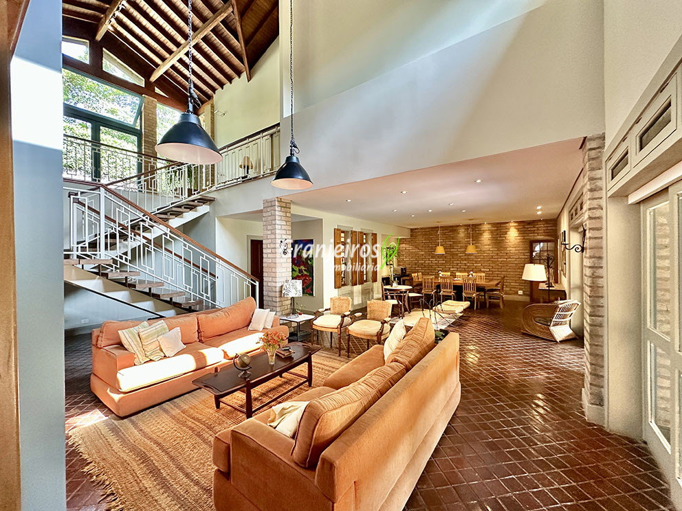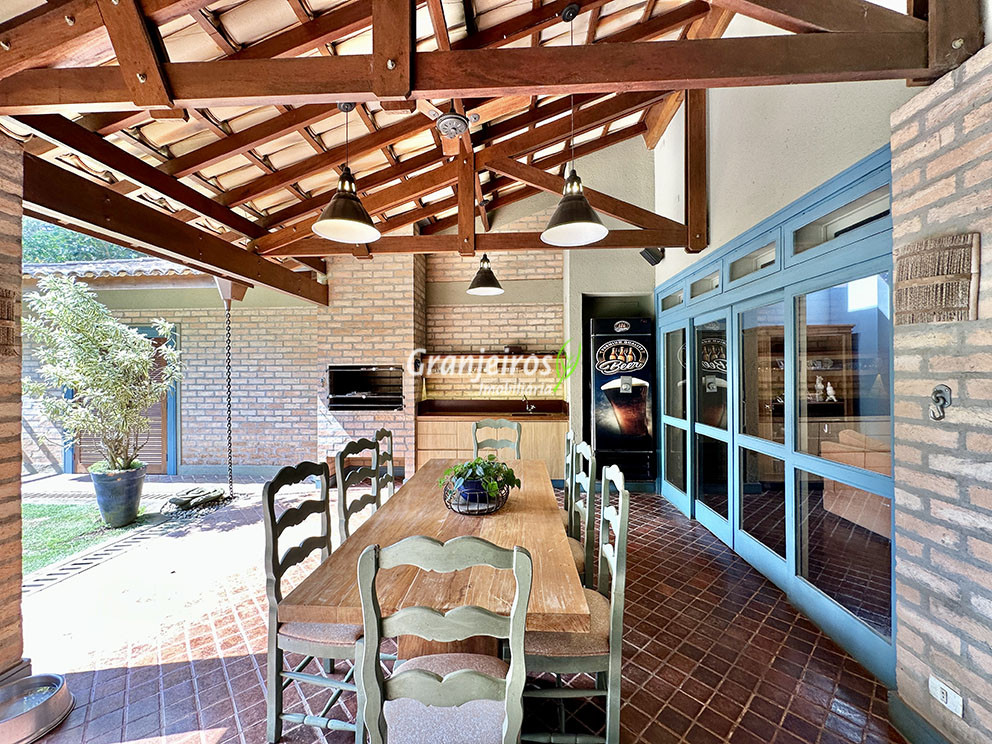 Casa construída por um casal de arquitetos, para morar! Ótima localização em final de rua tranquila, arborizada e sem saída. Condomínio fechado com controle de acesso e segurança 24 horas. Imóvel repleto de armários. Portas e janelas em madeira e vidro, com venezianas nos quartos. Muitas em Pinho de Riga, garimpadas em demolições. Pisos em mármore Travertino, porcelanato, tacos de madeira, cerâmica. Jardim com paisagismo formado, com irrigação automática programável. Projeto para construção da piscina, foi aprovado na prefeitura e registrado na matrícula em cartório. Só não foi construída por opção! Living para 5 ambientes integrados ao lazer com varanda gourmet e jardim gramado com gazebo. Estar, lareira a gás, jantar para 10 pessoas com aparador, música e bar. Varanda Gourmet ampla para 3 ambientes, refeições, estar e ganchos para 3 redes, voltada para o jardim com gazebo e local para piscina. Churrasqueira com bancada em madeira, cuba inox, gabinetes, espaço para geladeira e ganchos para 3 redes. Copa cozinha com espaço para almoço e café, repleta de armários planejados, vista para o jardim, integrada à sala de jantar e varanda gourmet, por um balcão retrátil com janelões basculantes, que se abrem parcial ou totalmente. Sala de Home Theater com frigobar, lareira à lenha, estantes e ar-condicionado. Escritório/ Atelier com varanda e escada de ferro p/ o mezanino, com ar-condicionado, preparado para claraboia, com acesso ao sótão e fácil manutenção na elétrica e hidráulica da casa.