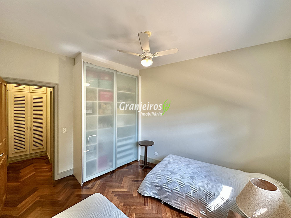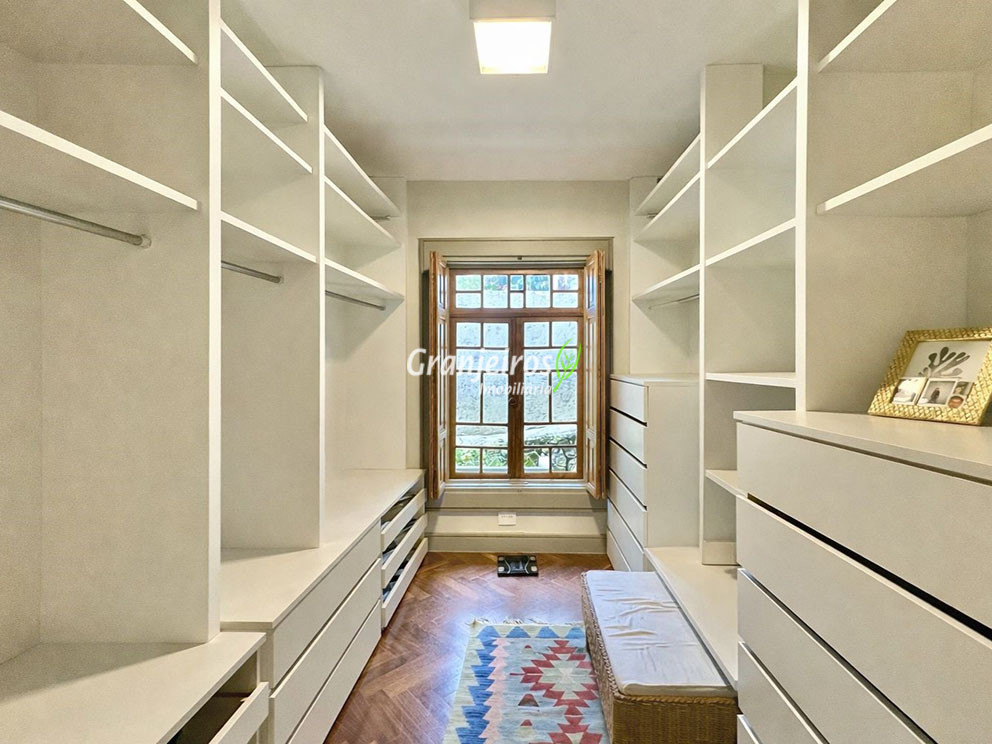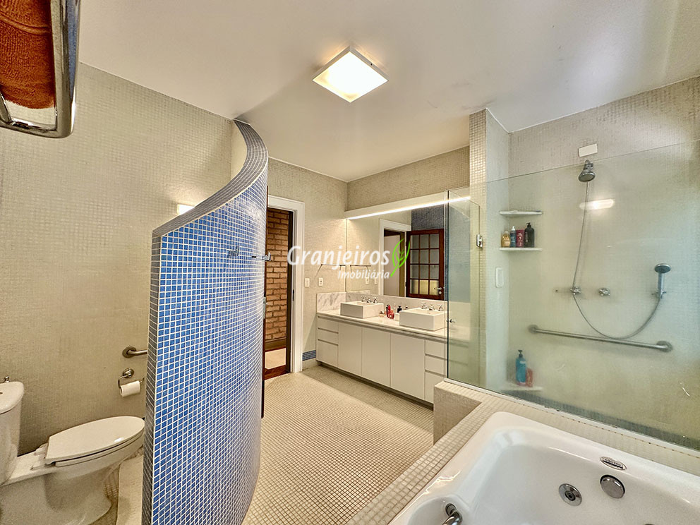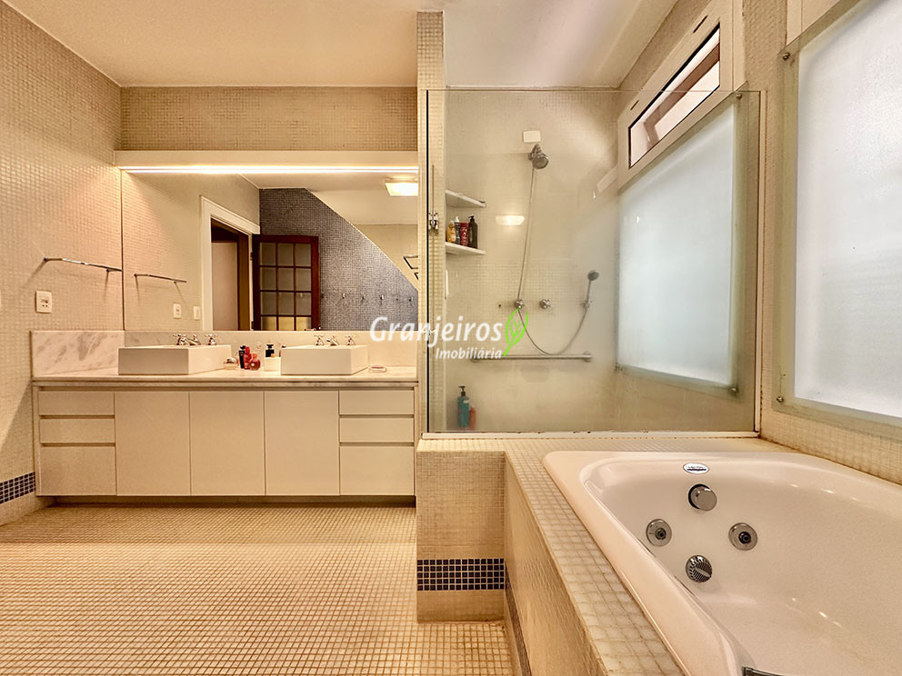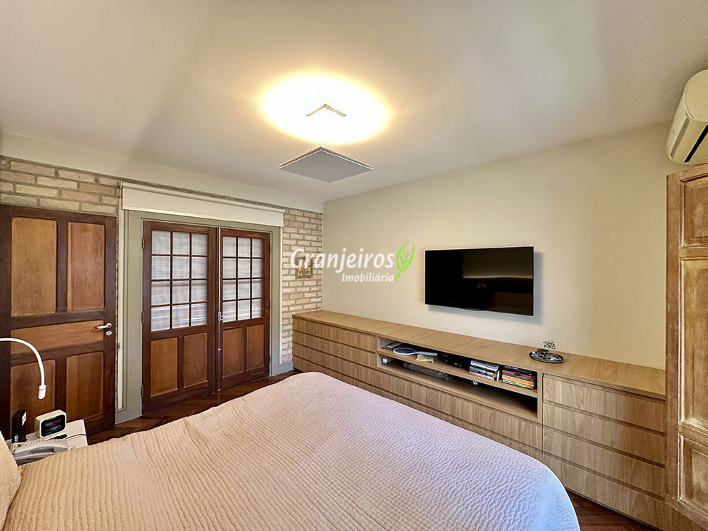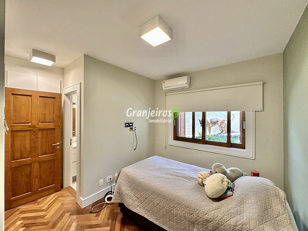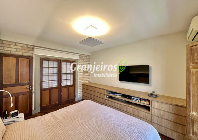 1 suíte master com ar-condicionado e porta balcão voltada para o jardim e varanda gourmet. Closet (Sr e Sra) com armários planejados, bancadas, gaveteiros e nichos. 2 suítes com armários, portas e janelas em madeira com telas e venezianas, uma delas com ar-condicionado. Suíte de hóspedes com armários de correr, closet com armário, ventilador.