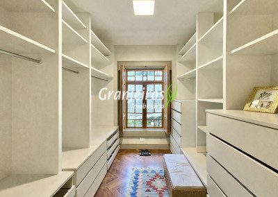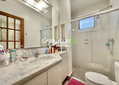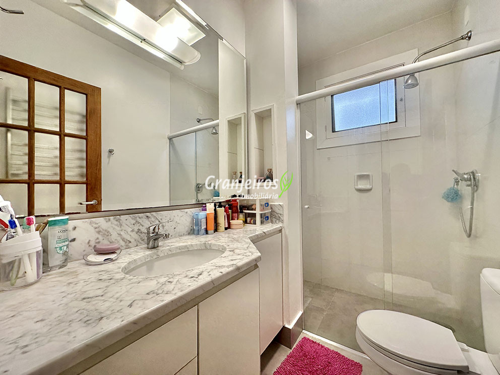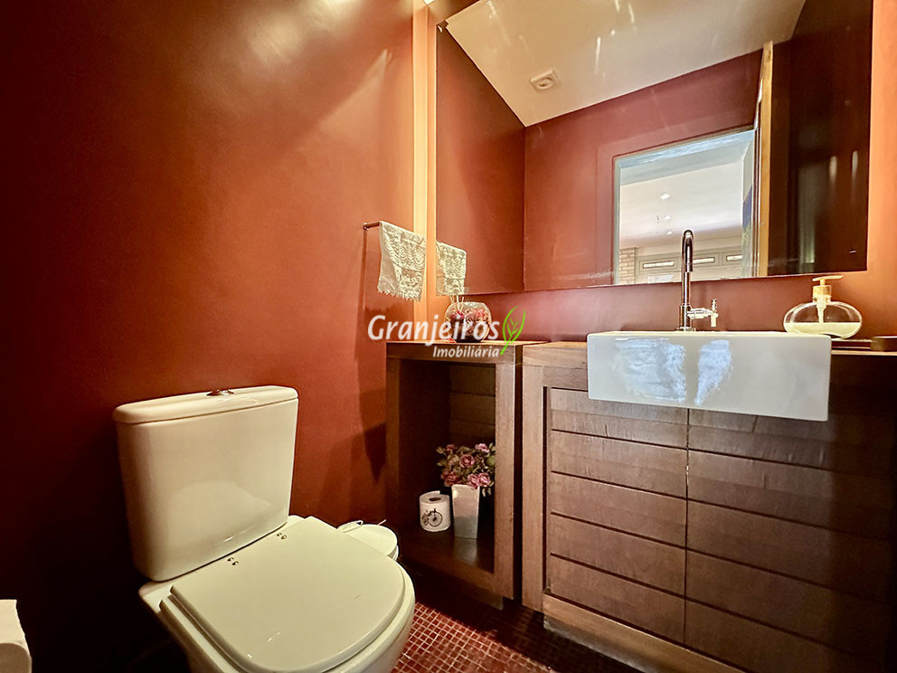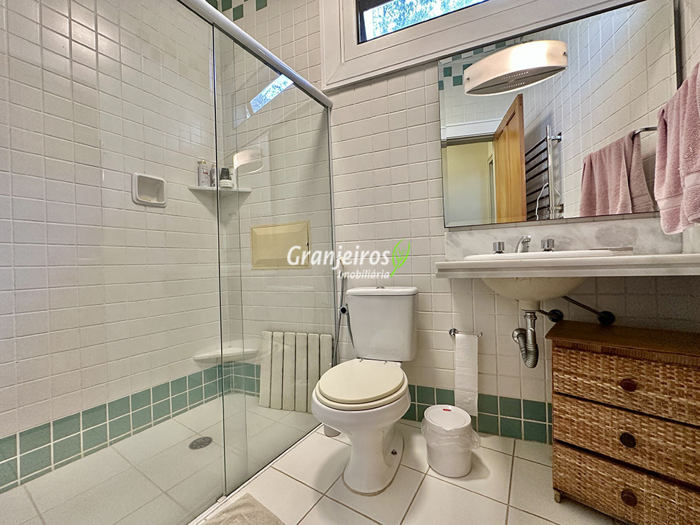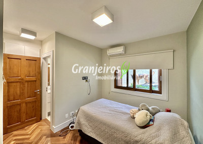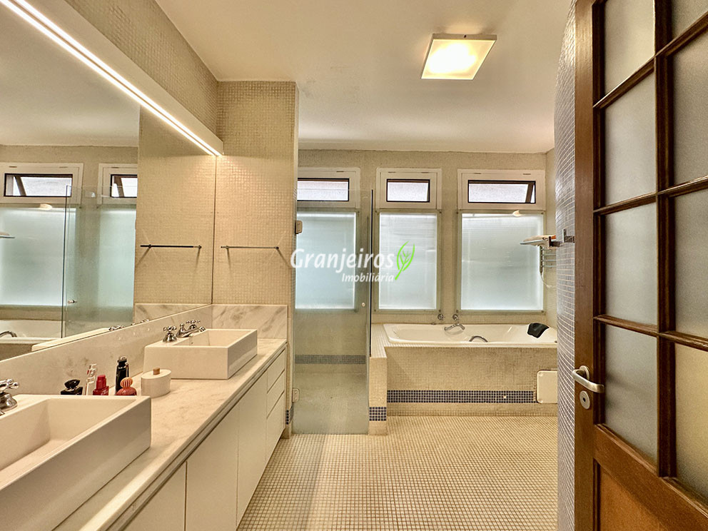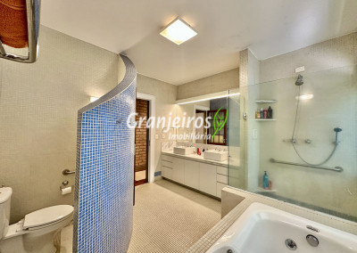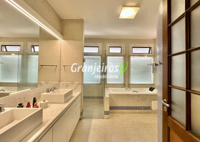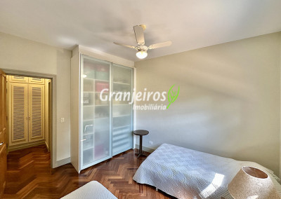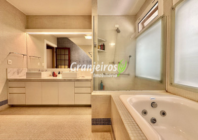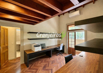 1 suíte master com ar-condicionado e porta balcão voltada para o jardim e varanda gourmet. Closet (Sr e Sra) com armários planejados, bancadas, gaveteiros e nichos. 2 suítes com armários, portas e janelas em madeira com telas e venezianas, uma delas com ar-condicionado. Suíte de hóspedes com armários de correr, closet com armário, ventilador.