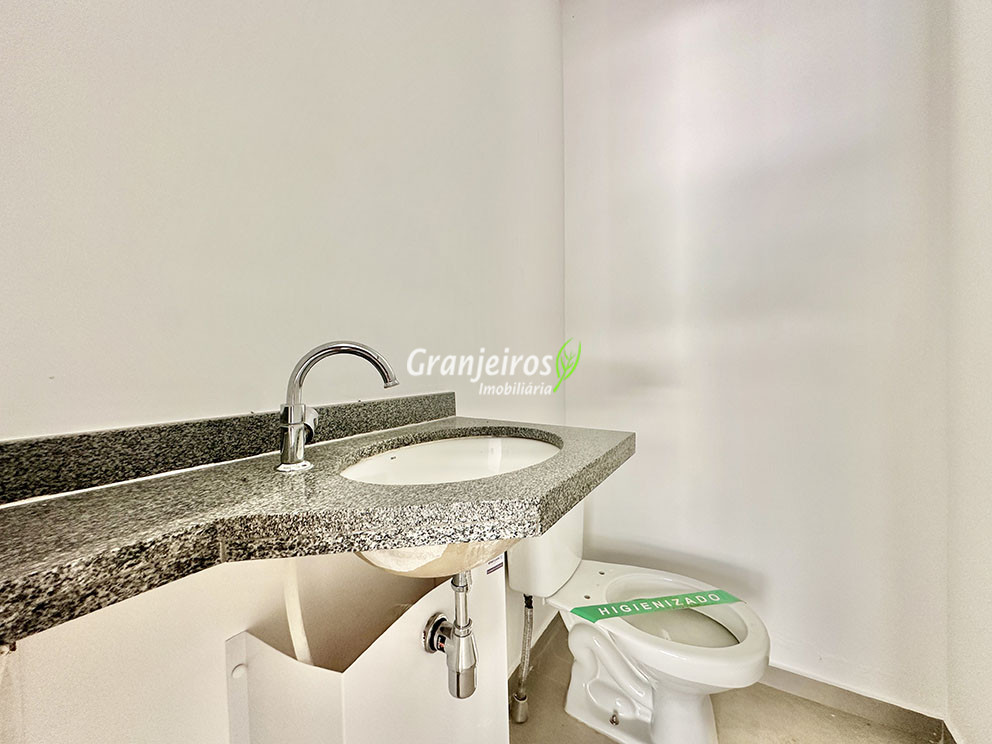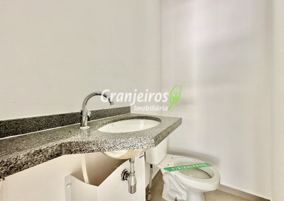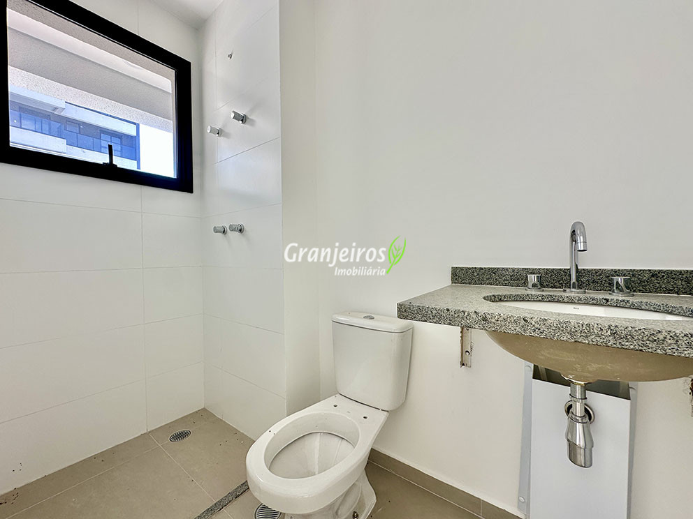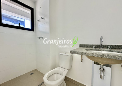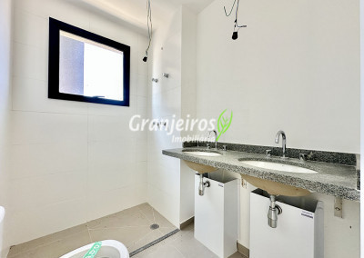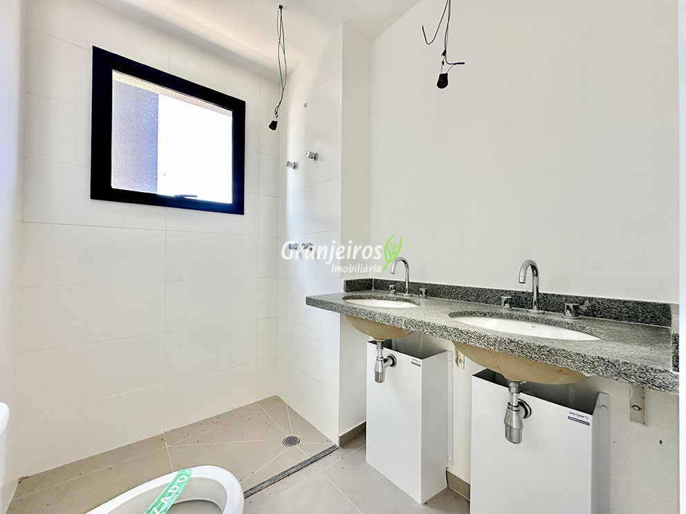 - Banheiros com piso em porcelanato e azulejos até o teto na área do box. Suíte master com duas cubas.