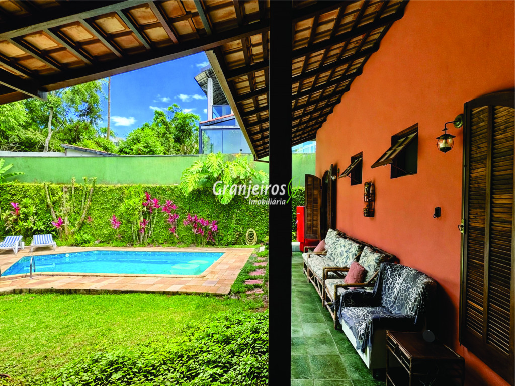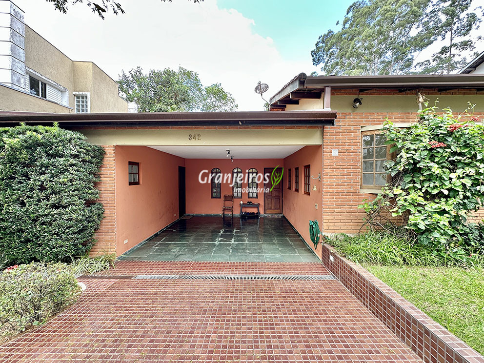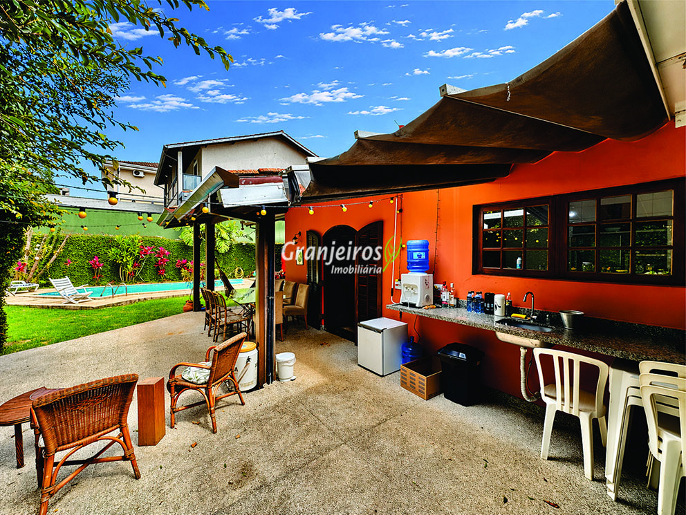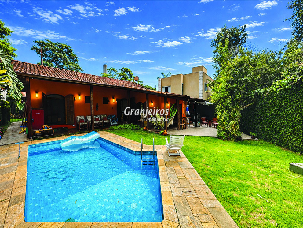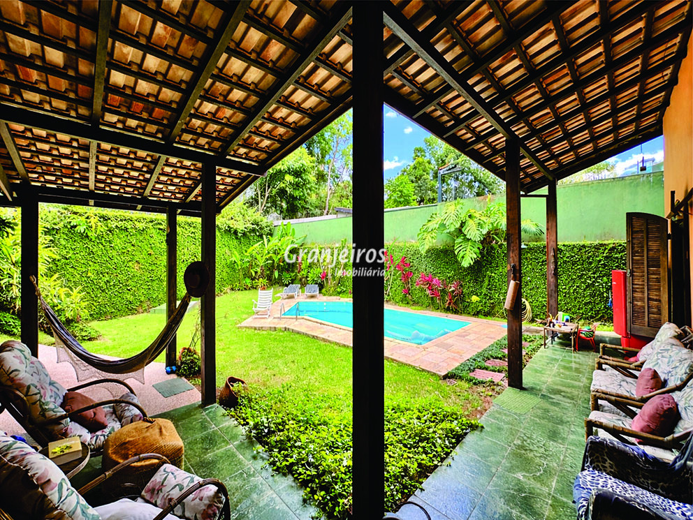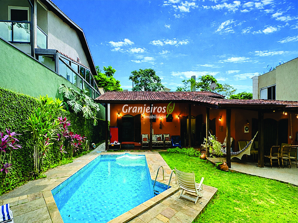 Casa térrea avarandada, construída para morar, com materiais de qualidade e manutenção permanente. Ótima localização em final de rua tranquila, arborizada e sem saída. Privacidade nos fundos com APP - Área de Preservação Permanente do condomínio. Imóvel repleto de armários em madeira maciça. Jardim com paisagismo formado. Living para 4 ambientes integrados à cozinha e voltados para varanda e lazer. Estar, TV, bar e jantar integrada à cozinha. Varanda em L integrada ao living e cozinha, com ganchos de rede, bancada em granito, cuba inox com espaço pronto para uma churrasqueira portátil ou até desenvolver uma área gourmet completa. Piscina de alvenaria 7m x 3m, revestida em vinil, aquecimento solar, solário e casa de máquinas. Copa cozinha americana planejada integrada à sala de jantar, com balcão, tampo em granito, 2 cubas inox e nichos. Lavabo com pia decorada. Hall íntimo envidraçado. 3 dormitórios sendo 1 suíte, todos com armários de marcenaria em madeira maciça, 2 dormitórios com portas balcão voltados para a varanda, jardim e piscina e a master com closet. Banheiros com bancadas em granito, gabinetes, espelhos e box de vidro, sendo a suíte master com hidro. Suíte de serviço. Depósito. Garagem para 4 vagas, sendo 2 cobertas. Permuta: Estuda por apto na região de Pinheiros (S.Paulo) até R$ 600 mil