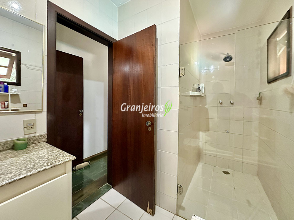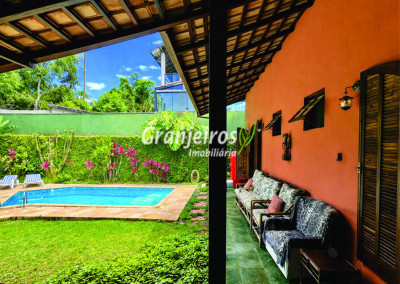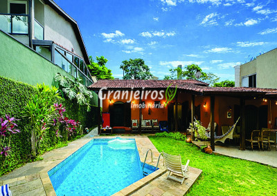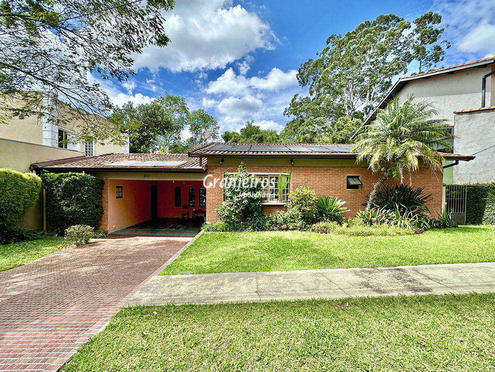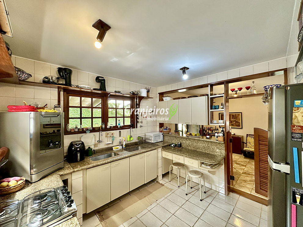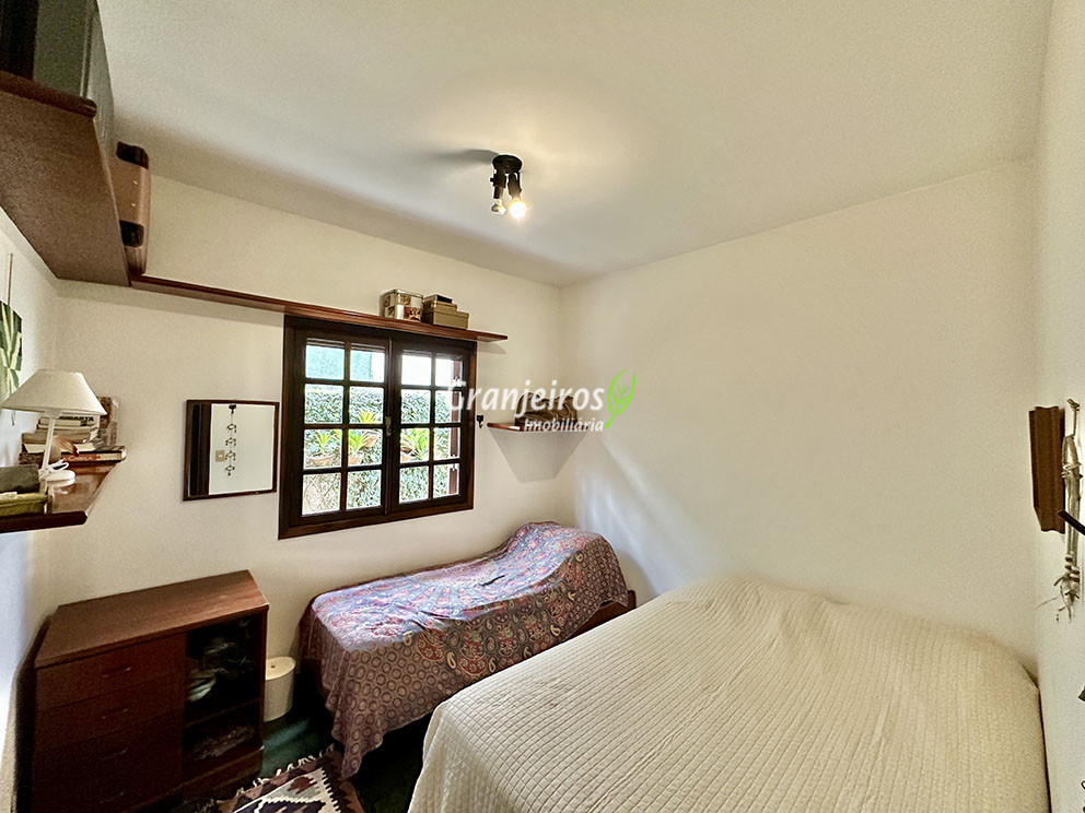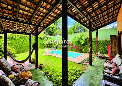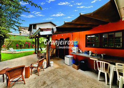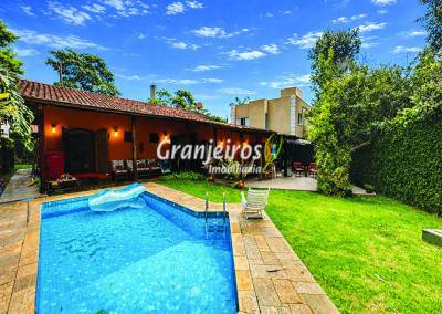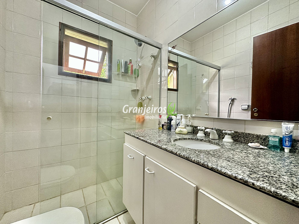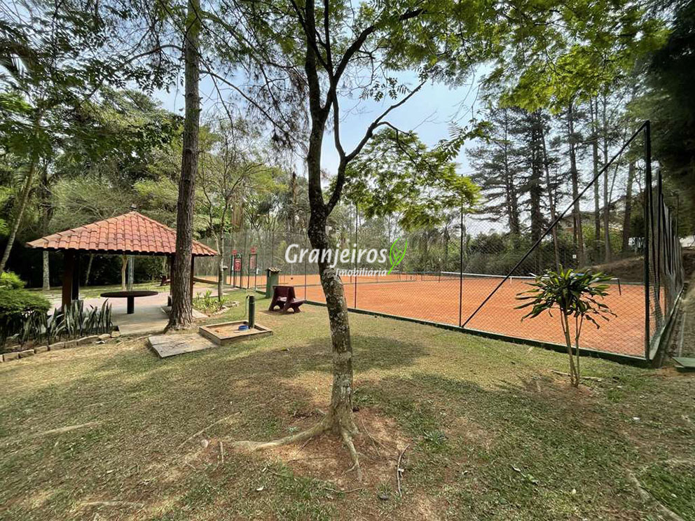 Casa térrea avarandada, construída para morar, com materiais de qualidade e manutenção permanente. Ótima localização em final de rua tranquila, arborizada e sem saída. Privacidade nos fundos com APP - Área de Preservação Permanente do condomínio. Imóvel repleto de armários em madeira maciça. Jardim com paisagismo formado. Living para 4 ambientes integrados à cozinha e voltados para varanda e lazer. Estar, TV, bar e jantar integrada à cozinha. Varanda em L integrada ao living e cozinha, com ganchos de rede, bancada em granito, cuba inox com espaço pronto para uma churrasqueira portátil ou até desenvolver uma área gourmet completa. Piscina de alvenaria 7m x 3m, revestida em vinil, aquecimento solar, solário e casa de máquinas. Copa cozinha americana planejada integrada à sala de jantar, com balcão, tampo em granito, 2 cubas inox e nichos. Lavabo com pia decorada. Hall íntimo envidraçado. 3 dormitórios sendo 1 suíte, todos com armários de marcenaria em madeira maciça, 2 dormitórios com portas balcão voltados para a varanda, jardim e piscina e a master com closet. Banheiros com bancadas em granito, gabinetes, espelhos e box de vidro, sendo a suíte master com hidro. Suíte de serviço. Depósito. Garagem para 4 vagas, sendo 2 cobertas. Permuta: Estuda por apto na região de Pinheiros (S.Paulo) até R$ 600 mil
