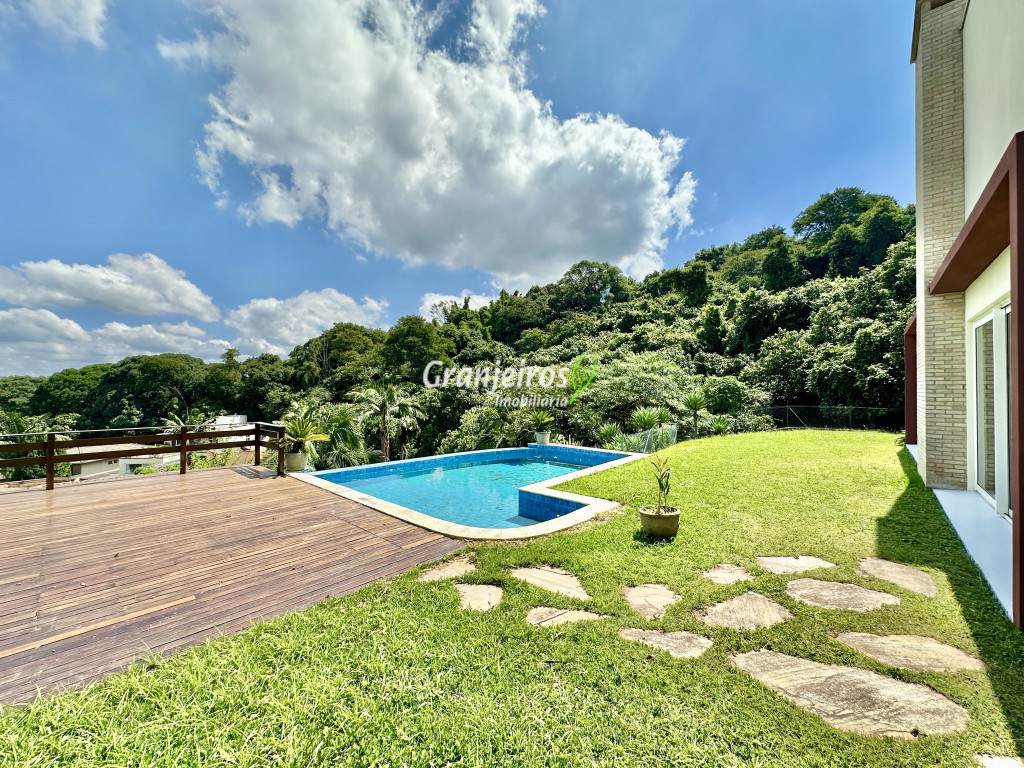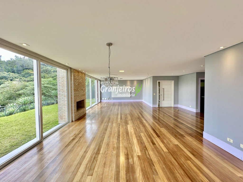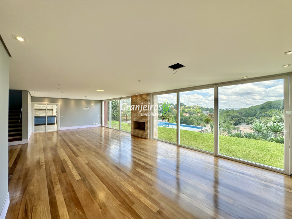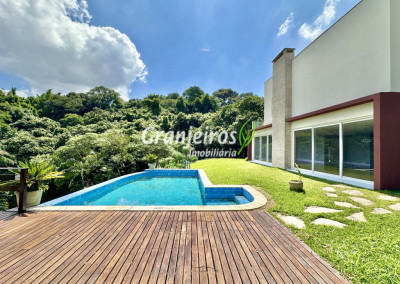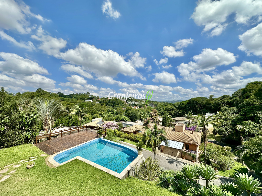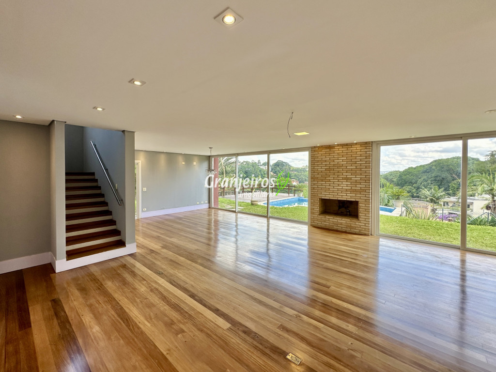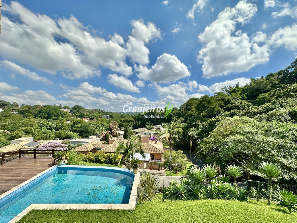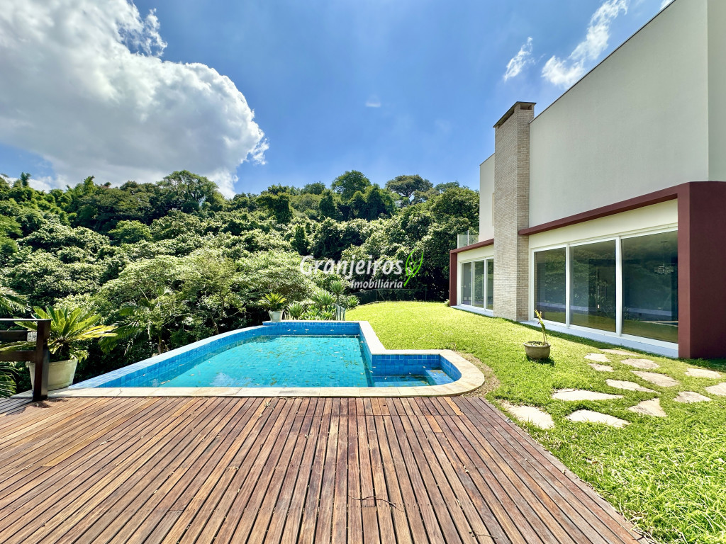 Condomínio residencial fechado, privativo, com poucas casas e muita natureza preservada. Linda casa moderna, com ótimo acabamento e vista deslumbrante. Casa integrada com a área gourmet e lazer. Envidraçada, ensolarada, arejada e muito bem iluminada. Repleta de armários. Pisos em tábuas de madeira, porcelanato e pedra. Portas e janelas alemãs em PVC com vidros temperados. Coifas em aço inox. Louças e metais Deca. 3 entradas: social, lazer e serviço. Hall de entrada social. Escritório, home theather. Living para 3 ambientes com lavabo. Salas de jantar, estar e lareira. Voltadas para o lazer com varanda gourmet e jardim. Varanda gourmet integrada com churrasqueira, coifa, forno de pizza, bancadas e gabinetes. Jardim com paisagismo. Piscina de alvenaria com hidro, borda infinita, solarium e deck. Vestiário. Escada revestida em madeira com guarda cormo em vidro e metal. 4 suítes, sendo 3 com ar condicionado e integradas por um grande terraço panorâmico com guarda corpo de vidro. Banheiros com detalhes em pastilhas, gabinetes, espelhos e box de vidro, sendo a máster com ponto para receber hidro. Copa cozinha com armários planejado, bancada em “U” e despensa. Área de serviço com lavanderia e armários planejados. Suíte de serviço com entrada independente. Garagem para 5 vagas, sendo 3 cobertas. Aquecimento: Boiler solar com suporte elétrico. Abastecimento de água: Sabesp. Permuta: Estuda proposta por imóvel com liquidez em São Paulo, Granja Viana ou Jundiaí.